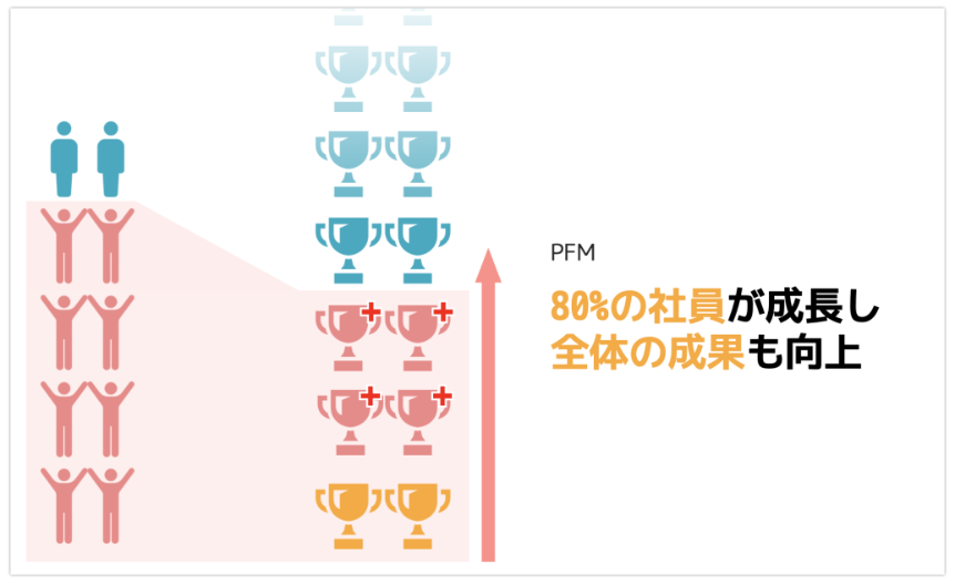 しかし、PFMでは客観的な「行動」をベースにすることで社員一人ひとりのパフォーマンスやデータに基づいた介入をし、コストや手間を抑えた組織マネジメントを可能とします。そのため、80:20の法則でいうところの「80」の社員を戦力化することができるという大きなメリットがあります。