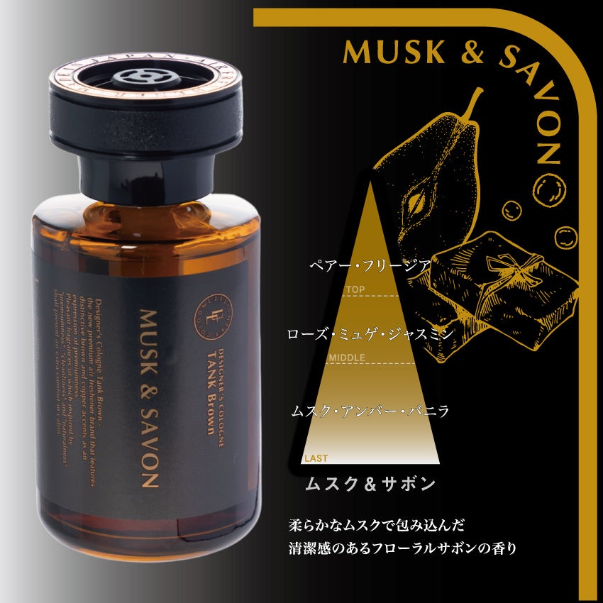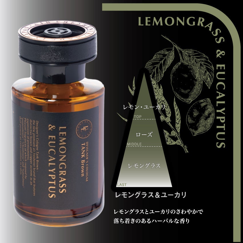 シリーズ累計販売数400万個を突破した自動車用芳香剤デザイナーズコロンシリーズの新シリーズです。ブラウンとブロンズカラーを基調としたデザインでまとめた高級感のある大人の芳香剤です。