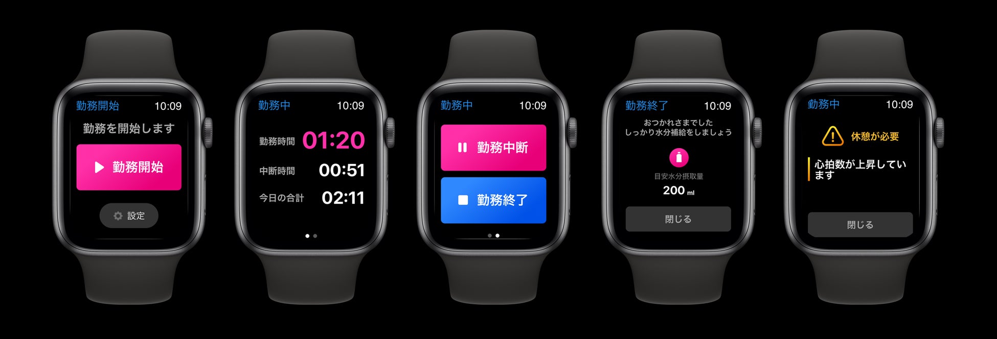 「Apple Watchアプリケーション」では、Apple Watchで自動計測されるヘルスケアデータ(心拍数や血中酸素ウェルネス)から、異常な数値が記録されていないかどうかを独自のロジックで診断し、異常数値の検知時には装着者と管理者に通知を行います。