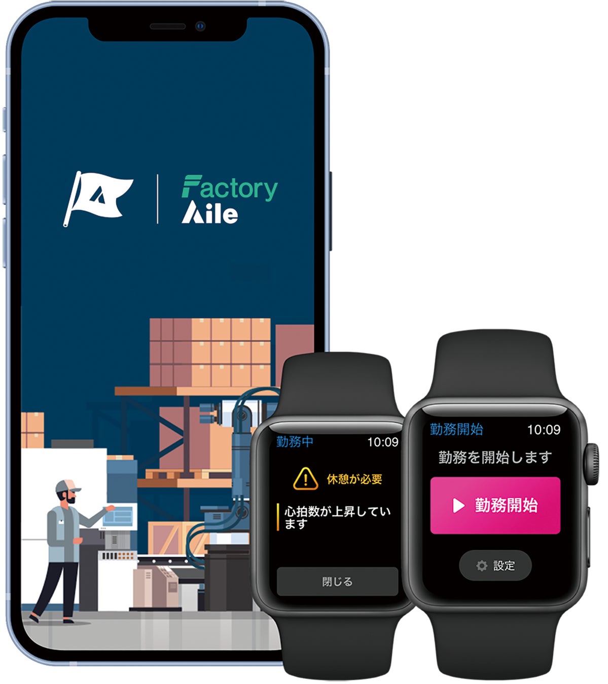 「Factory Aile」は、従業員の方にApple Watchをつけていただくだけで、Apple Watchから取得されるヘルスケアデータで、従業員の健康状態を把握できる工場や倉庫などの職場環境向けのヘルスケアサービスです。Apple Watchから取得されたヘルスケアデータを蓄積し、従業員の活動量や健康状態をモニタリングすることができます。また、異常数値や転倒を検知した場合に、管理者や周囲の人に通知することもできます。高所や高温な場所での作業や一人作業時の安全対策として、または従業員の健康管理の一貫として活用いただけます。