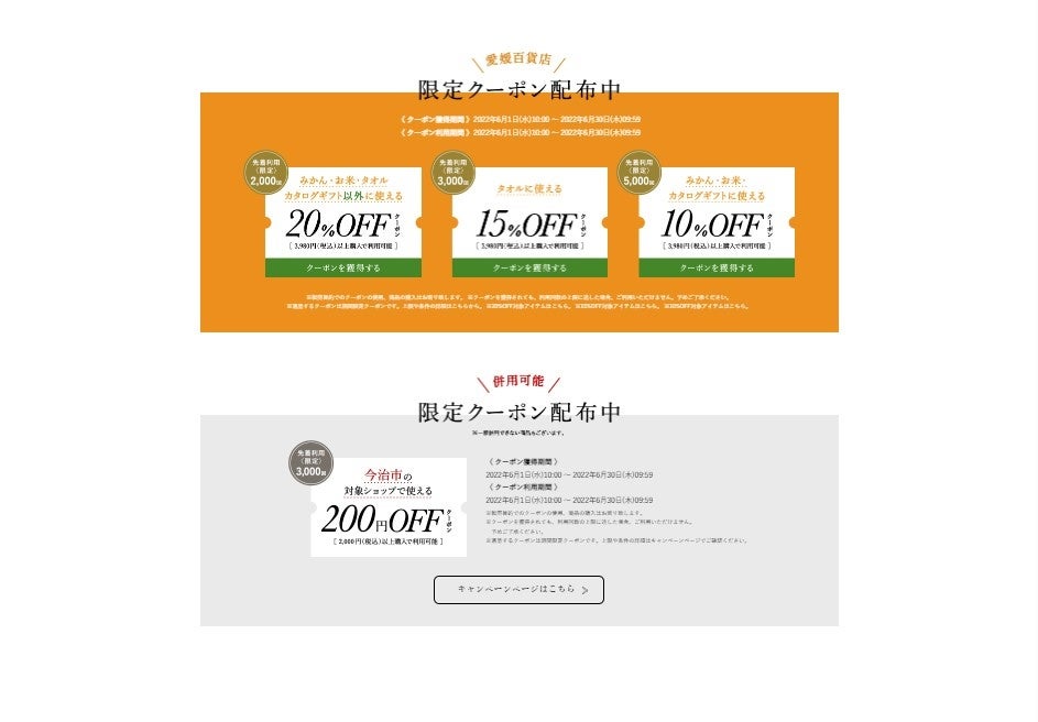 ②3,980円以上のお買い上げで“愛媛のタオル”に使える15%OFFクーポン(先着3,000回)