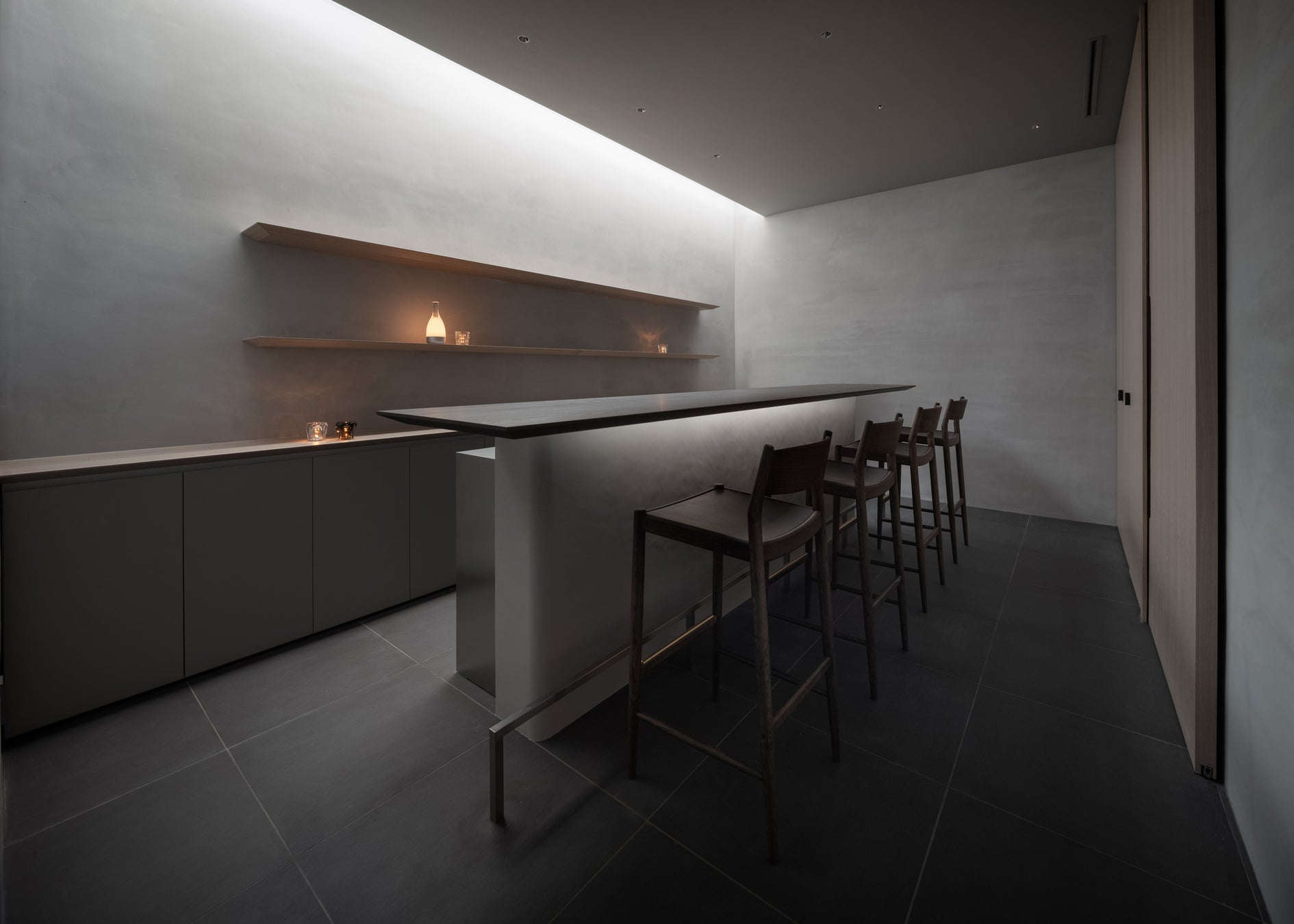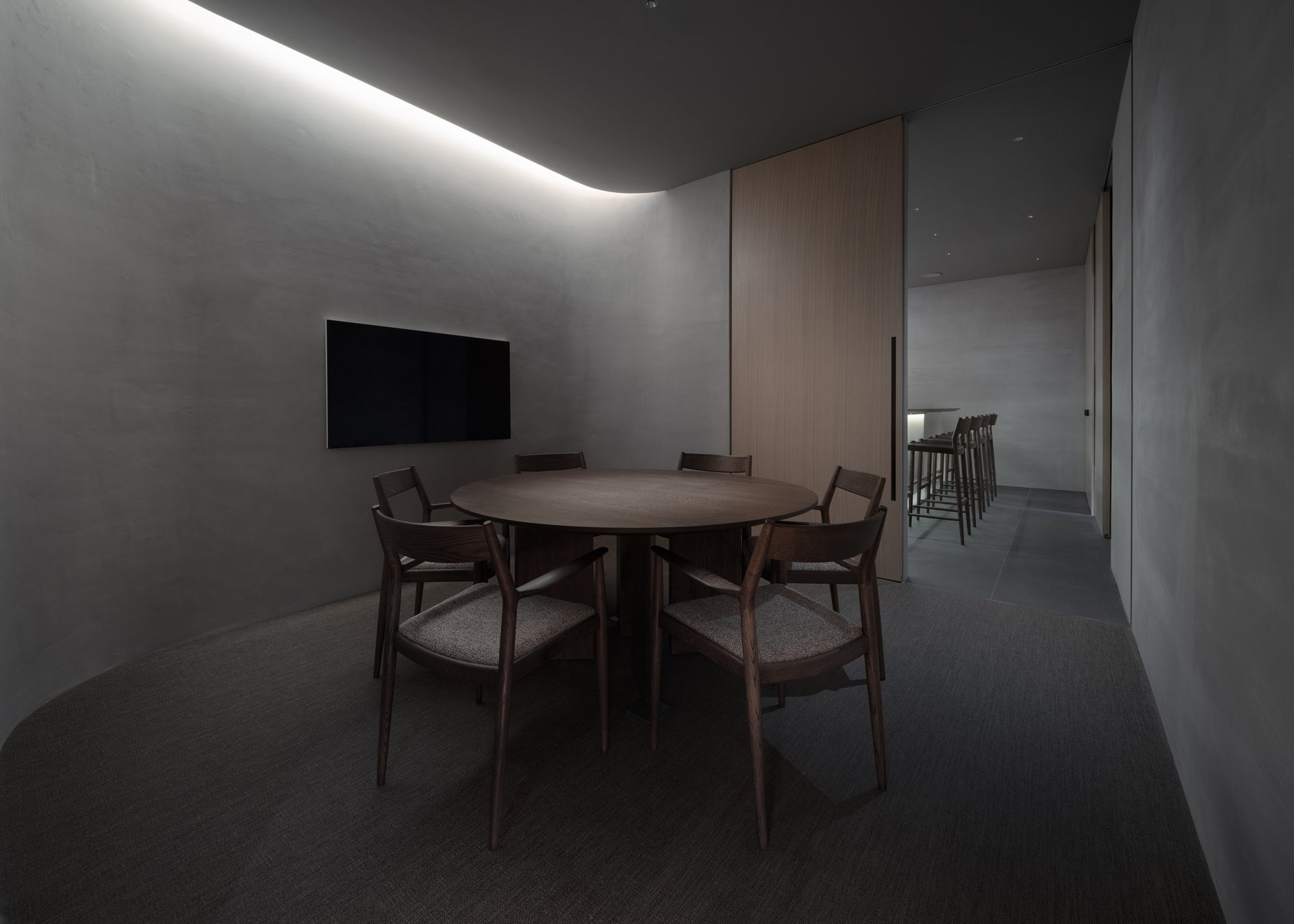 また、その後ろには左官材や木材等の質感のある素材で仕上げた柔らかさを感じる2つの部屋を計画。ハイカウンターとダイニングのような円形テーブルを配置し、実際に製品が使用されるシーンを体感できる落ち着いた空間としています。(建築家:鬼木孝一郎)
