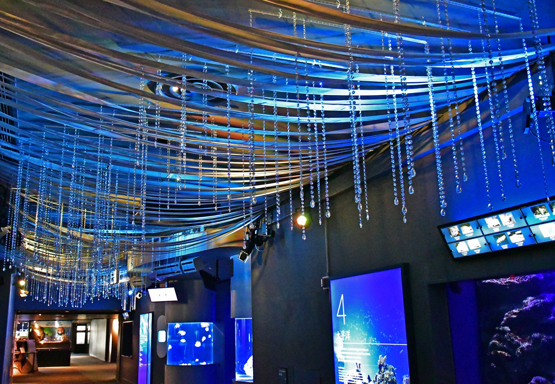 会期中、相模湾大水槽は輝く宝石をイメージしたオブジェとクリスタルカー テンのきらめきに包まれます。朝、昼、夕方には、水中を宝石が舞うような美しい泡の演出をお楽しみいただけます(約 2 分間)。
