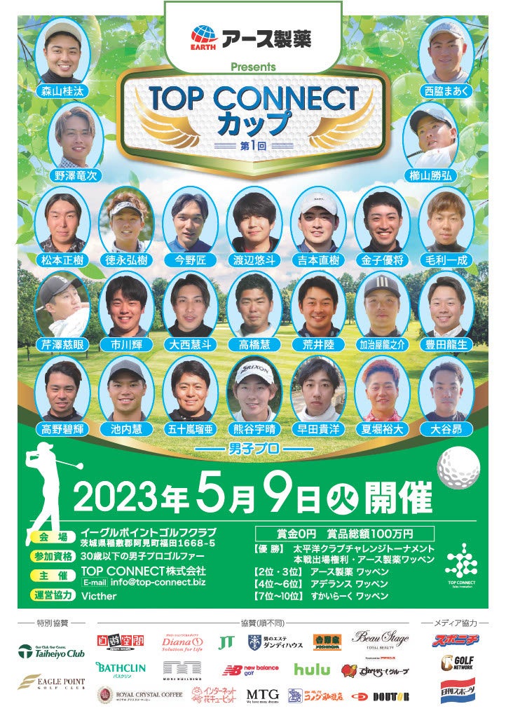 TOP CONNECT 株式会社(東京都中央区 / 代表取締役 内田雅章、以下 TOP CONNECT)は、30歳以下の若手男子プロゴルファー支援を目的にしたこれまでにない新しい形式の大会「アース製薬 Presents 第1回 TOP CONNECT カップ」を、2023年5月9日(火)、イーグルポイントゴルフクラブ(茨城県稲敷郡阿見町福田 1668-5)にて開催します。
