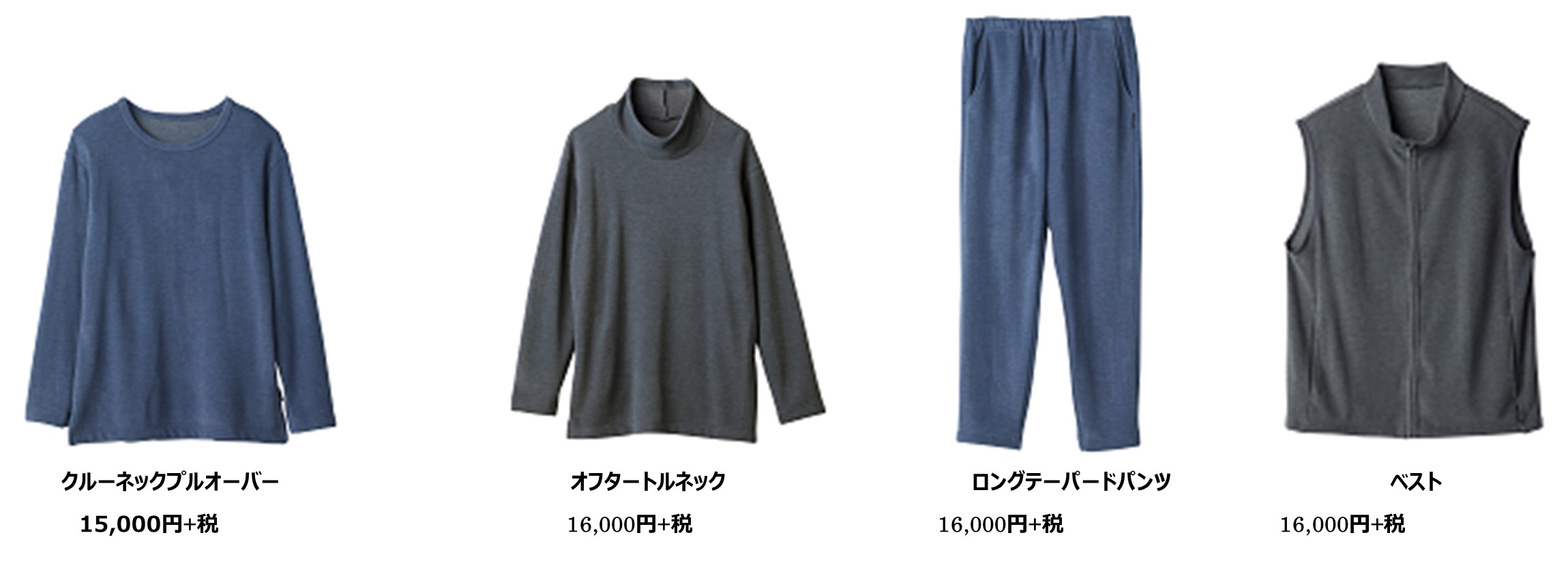 冬のリカバリーシーンにあわせ、メンズは4型2色、レディースは5型3色、アクセサリー2型3色の豊富なラインナップです。首元もあたたかいオフタートルネックや足元のあたたかさを逃さないシルエットのウエスト調節可能なテーパードパンツに加えて、毎日のおうちコーディネートが楽しくなるよう、レイヤードアイテムのメンズベストやレディスカーディガンもラインナップ。また、ブランケットとスヌードの小物は気軽に使える便利なあたたかアイテムです。