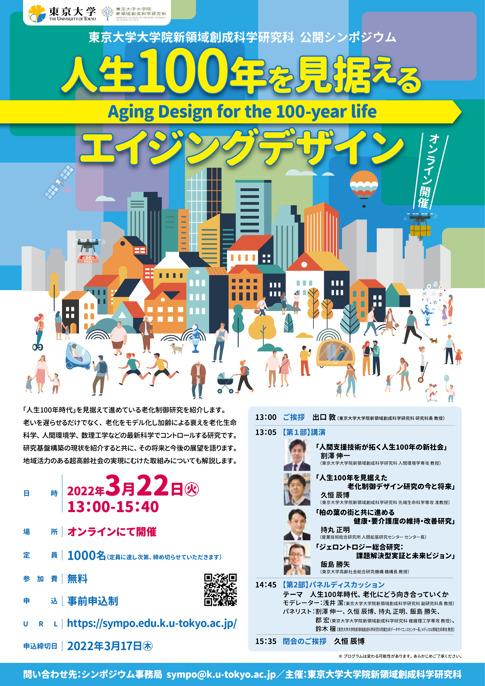 東京大学大学院新領域創成科学研究科は、2022年3月22日(火)13時より公開シンポジウム「人生100年を見据えるエイジングデザイン」をオンラインにて開催します。