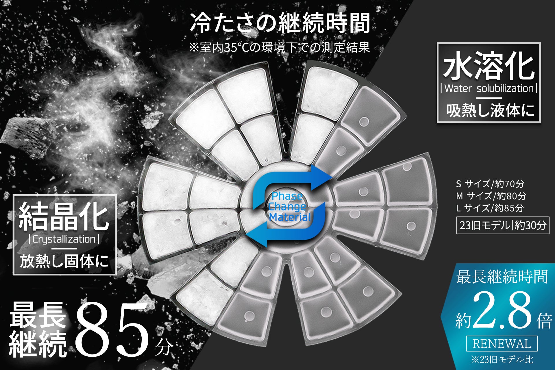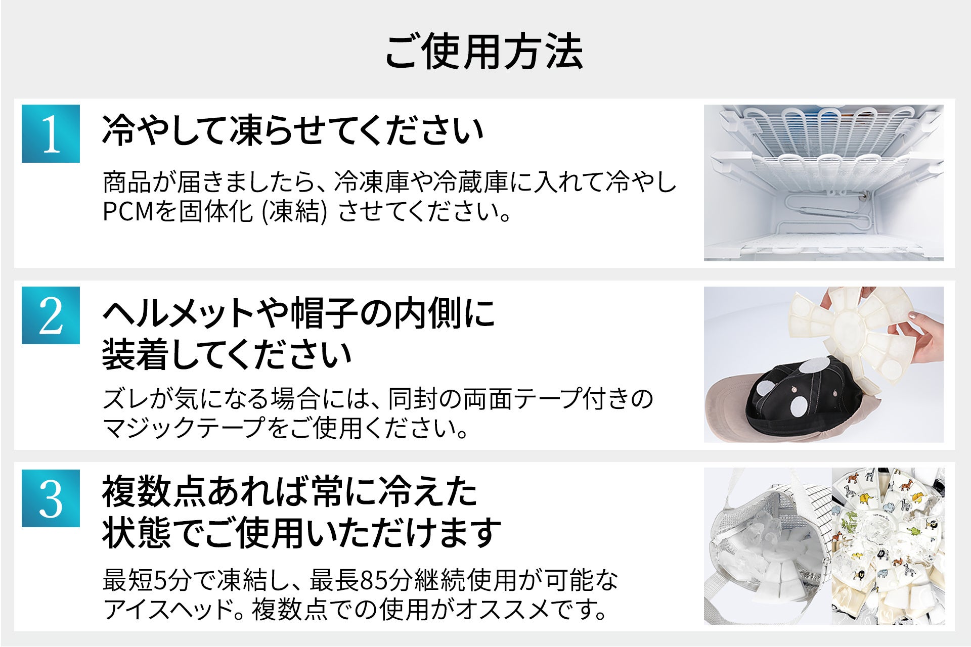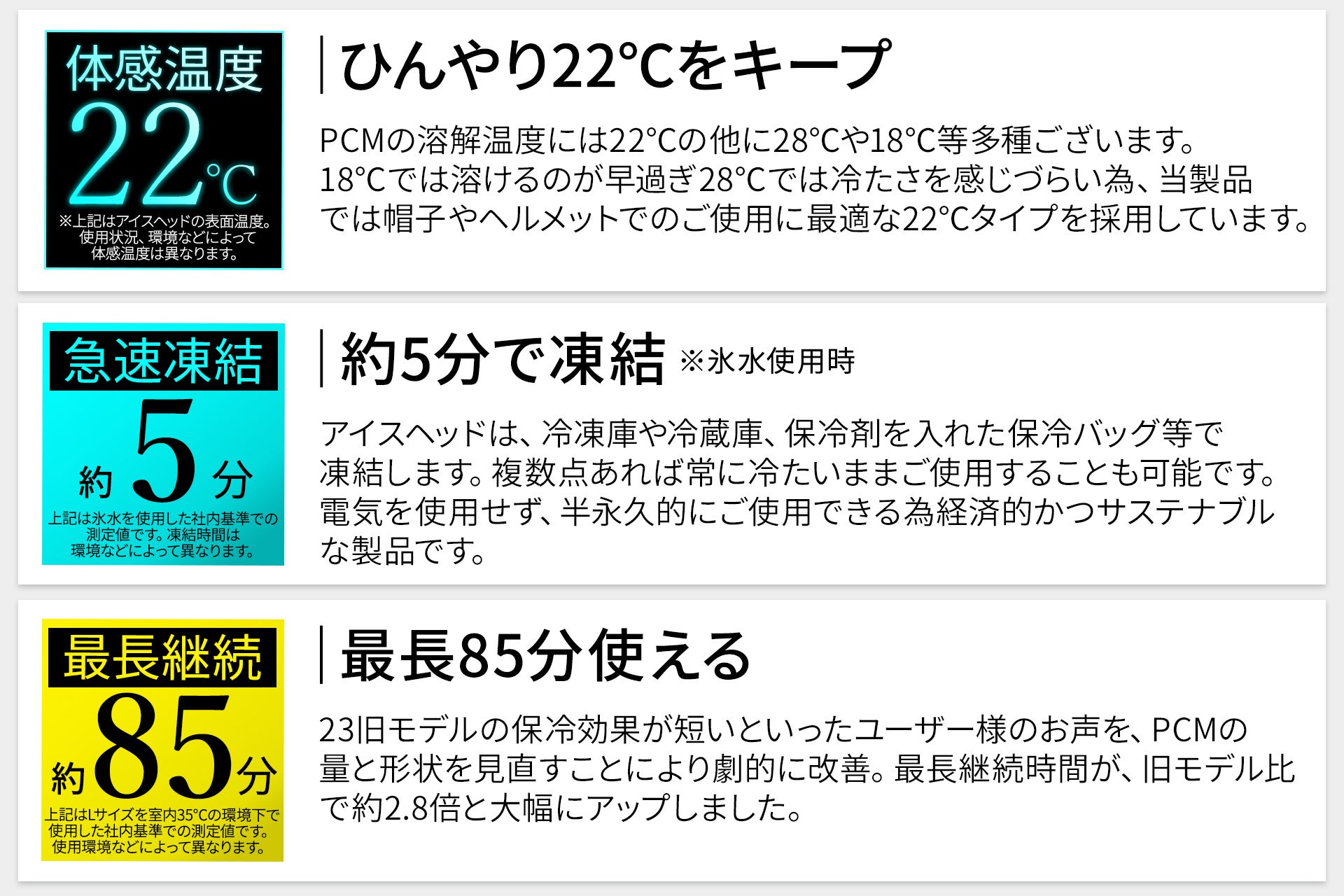 アイスヘッドは22℃タイプのPCMを使用し、類似品でみかける28℃タイプよりも、冷感をしっかりと感じることができます。半永久的に使える、熱中症対策にはもってこいのサステナブルな冷感グッズです。