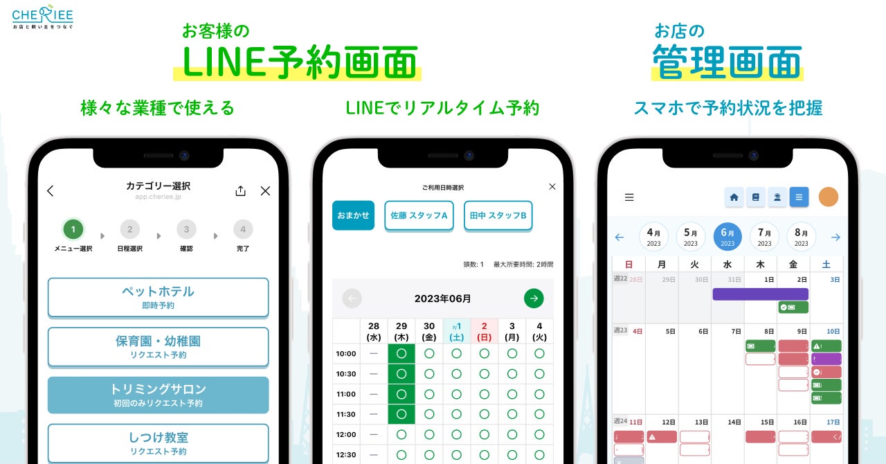 シェリービジネスポータルでは、2021年にペット業界初となるLINE予約システムをリリースしました。当初はトリミングサロンとペットホテルを対象としたものでしたが、他のサービスからも大きな注目を集めました。ペット市場の拡大とともに予約システムの重要も高まり、実際に多くの問い合わせをいただきました。