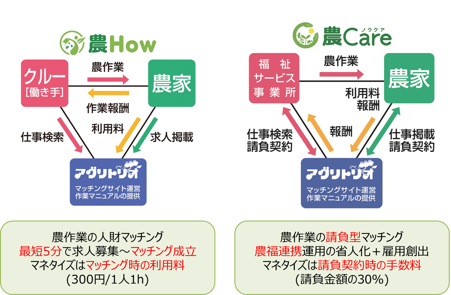 アグリトリオは、農家の深刻な人手不足や後継者不足を解決するため、個人と農家をつなぐプラットフォームサ-ビス「農How®(ノウハウ)」と福祉施設と農家をつなぐ「農Care®(ノウケア)」の提供を2020年4月から開始。農How®は、モバイルアプリでも提供しており、全国展開へ向けサービス利用地域を増やしています。