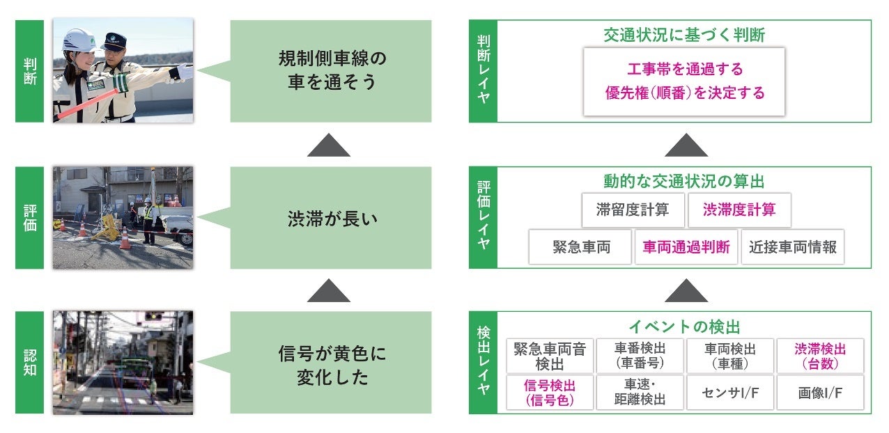 最新センサー技術と画像認識技術を用い、車両の片側交互通行の誘導を自動化。