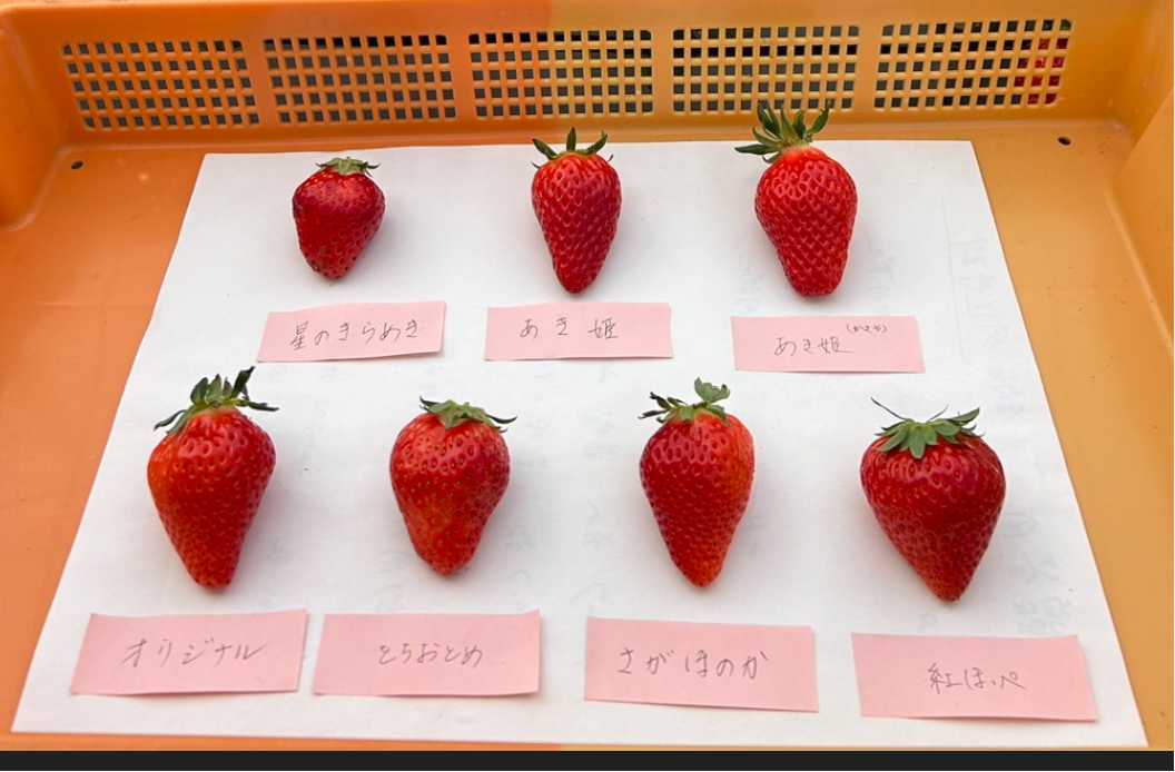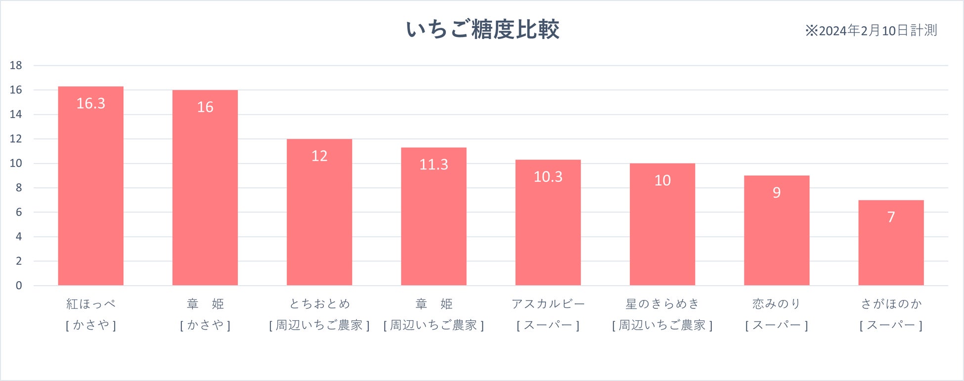 今回はスーパーに並ぶ甘みの強い品種、周辺地域のいちご園の品種等と合わせて糖度を計測して表にしてみました。