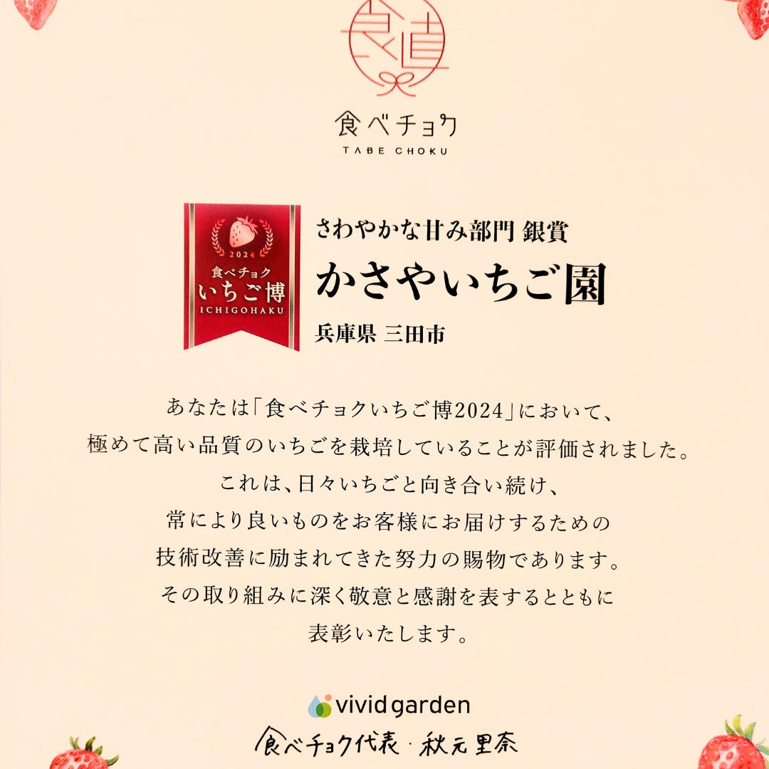 その中で、かさやいちご園の章姫が日本最大の産直サイト食べチョクが全国各地60の農園を集め開催したいちご博 2024で、兵庫県では唯一銀賞を獲得することができました。