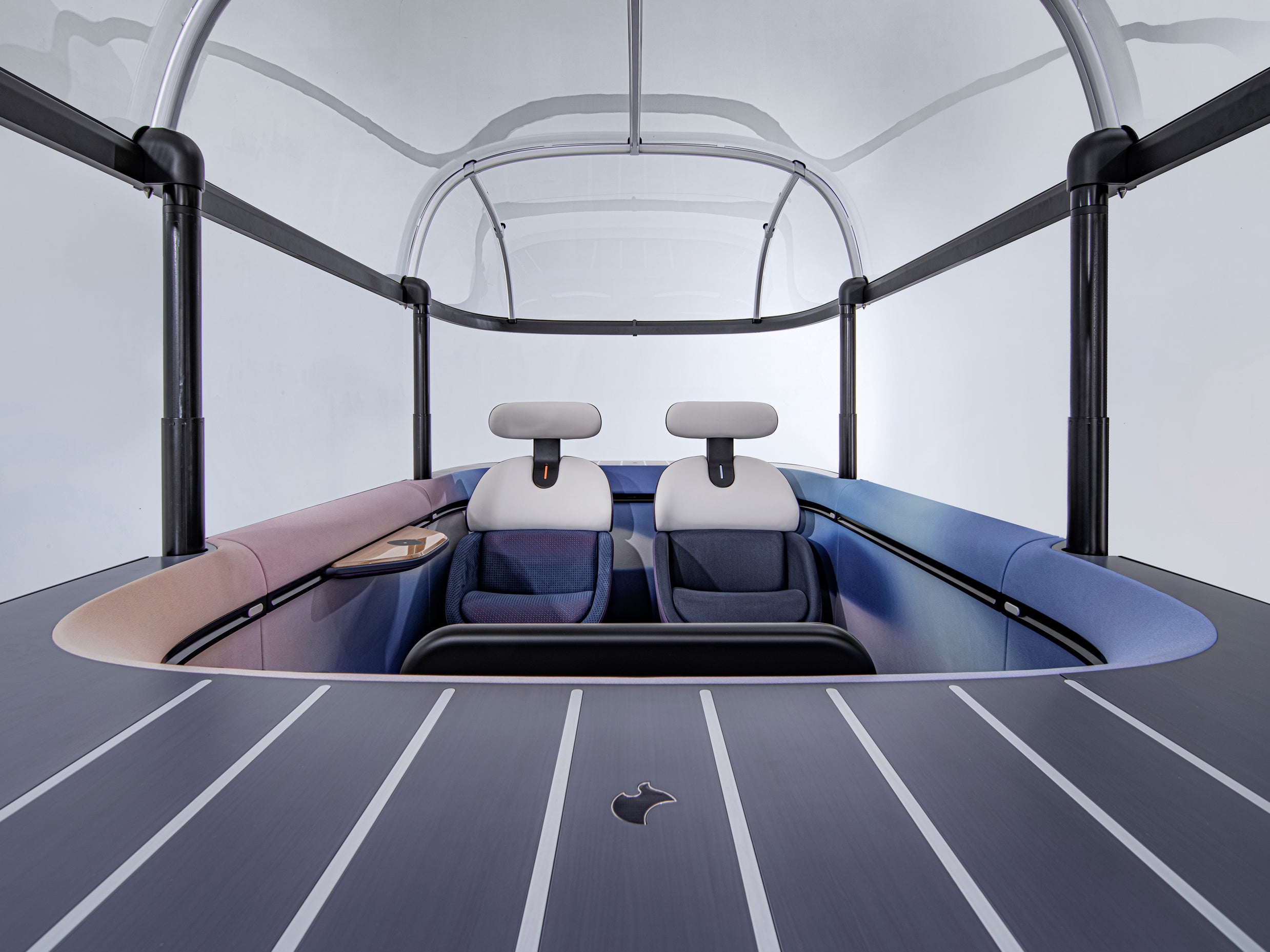 日常の生活が移動によって妨げられないように、「AKXY2」には椅子やテーブルなどさまざまなプロダクトを自由に取り付け、内装空間をパーソナライズすることができます。それは床にマグネットグリッドを配置し、壁にはスリットを採用したことで可能となりました。また、スリット内には空調設備やセンサーなどを搭載することもできます。インテリアのカラーリングはエクステリアとは対照的にカラフルで個性的にまとめました。さまざまな色のファブリックやサステナブル素材を採用することで、ダイバーシティの時代を象徴する内装空間としています。バスタブの外側にはウッドデッキ、車両の前後端には腰掛けを配置し、キャノピーが垂直に開閉することで360度、内と外の両方からさまざまな使い方が出来ます。