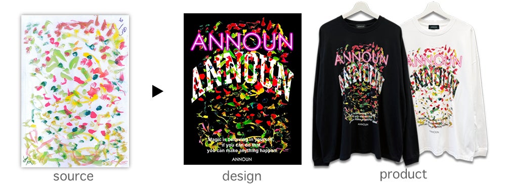 ANNOUN はバルネラブル・アート(障害をもった人や手助けが必要な人が作り出すアート)作品に、未知の可能性を感じ、インスピレーションを受け、原画にANNOUNのデザインのフィルターを通じコラボレーションした製品を発表、販売しております。