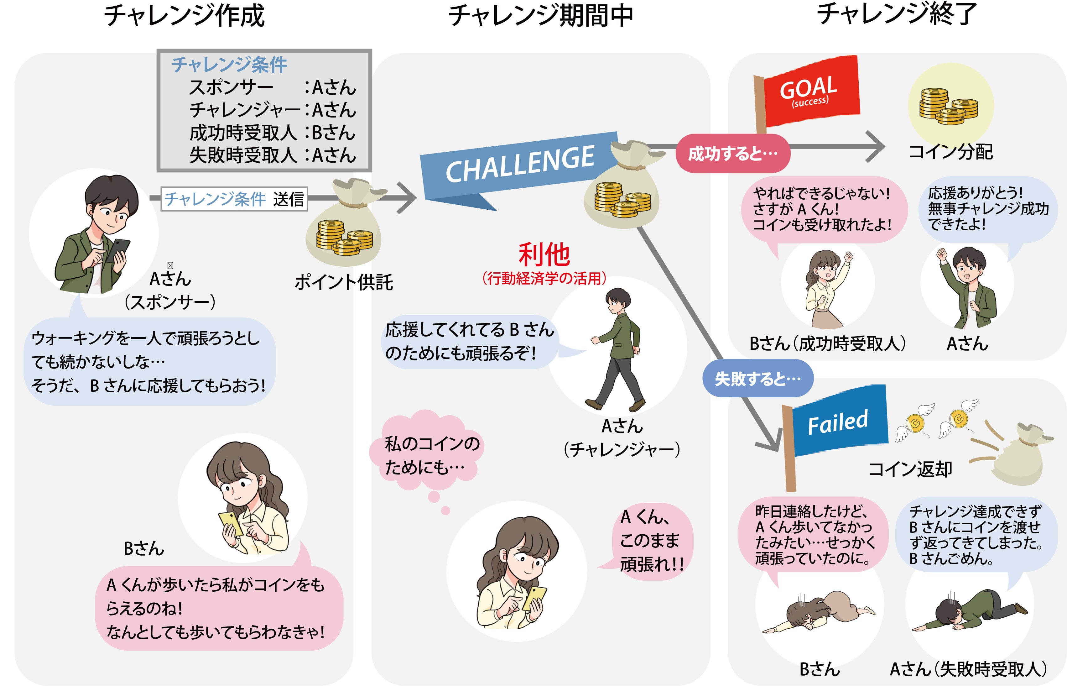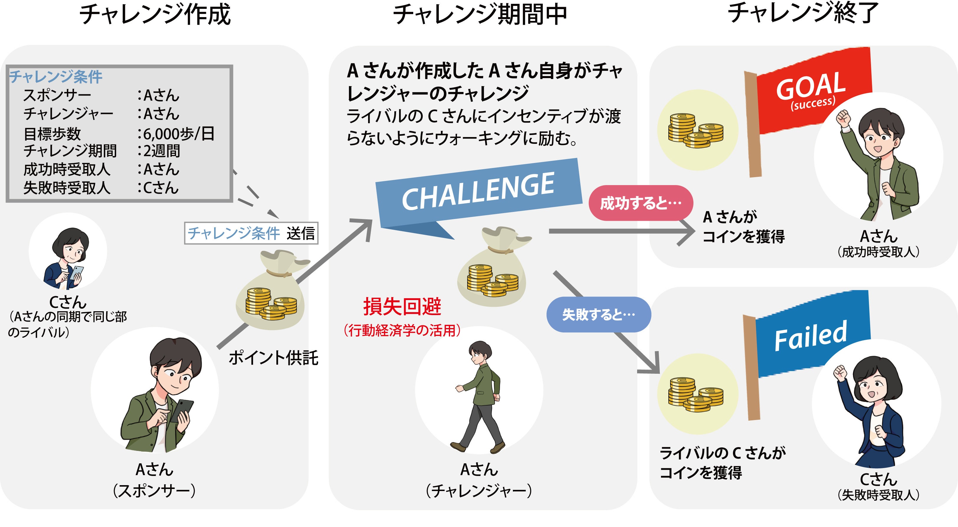本サービスでは、会員が、専用サイトから事前に購入したポイントを使用して「歩かないと自分がポイントを失い損をする」「自分が歩かないと同僚、家族等がポイントを失い損をする」等の自分に合ったインセンティブ設計のチャレンジを作成してウォーキングを行います。チャレンジの成功・失敗に応じてインセンティブが分配されます。