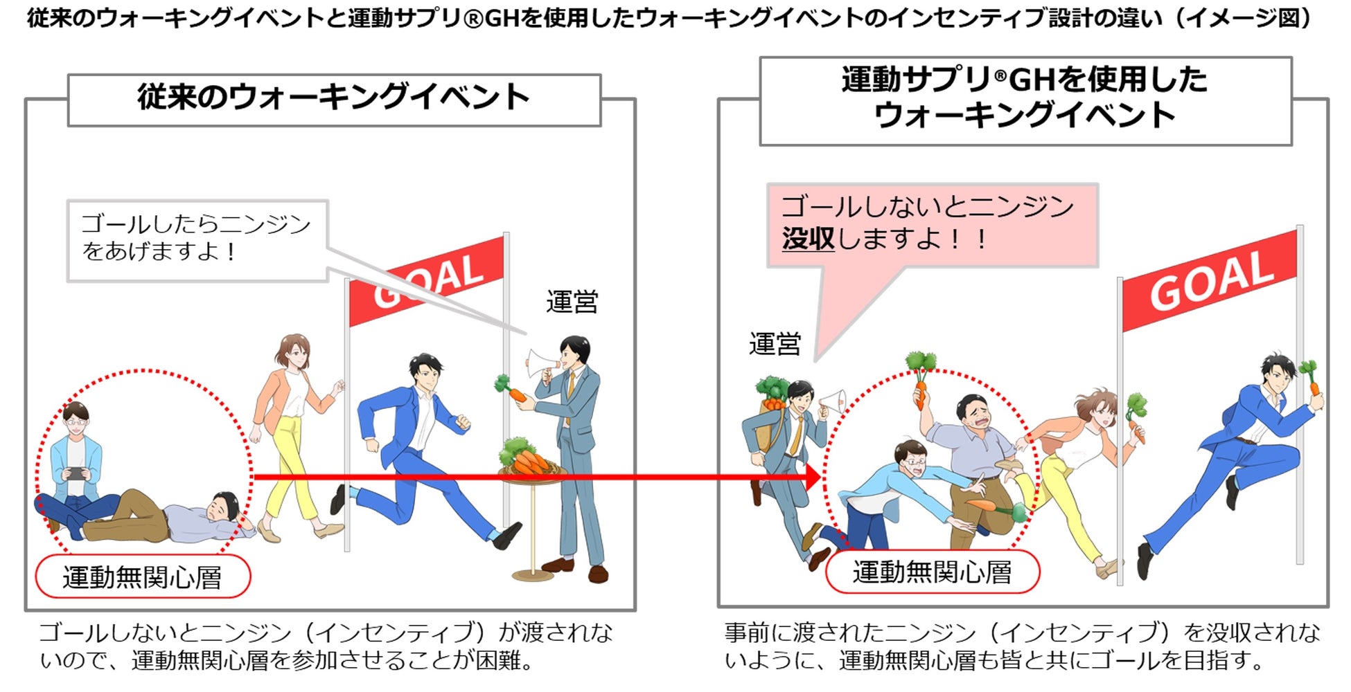運動サプリ®GHを使用したウォーキングイベントは、従来のウォーキングイベントに参加してもゴールにたどり着かなった運動無関心層の参加者のウォーキングを促進することが可能です。