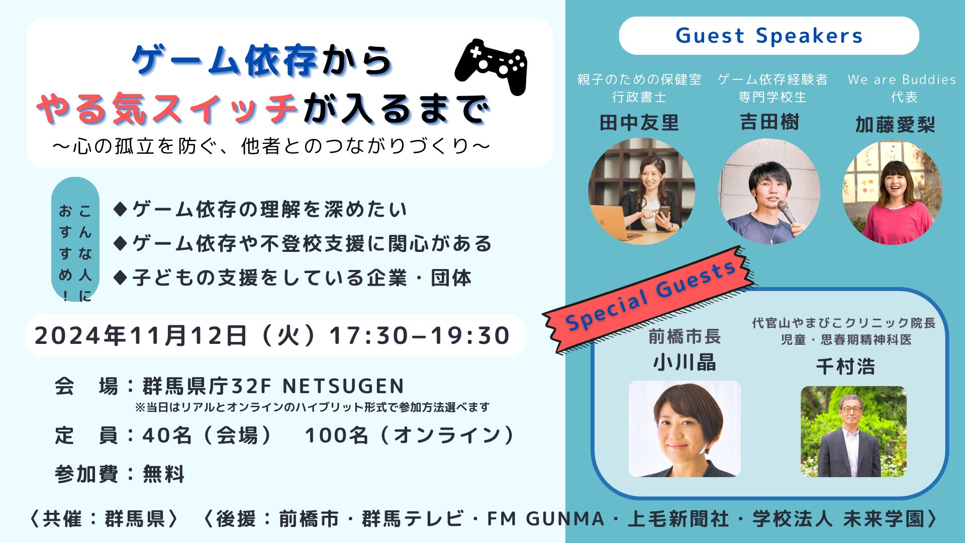 心の孤立の予防に取り組む We are Buddies 、ゲーム依存の予防・改善に取り組む専門家と共に「子どものゲーム依存と心の孤立」をテーマにイベントを開催【群馬県共催・前橋市後援】