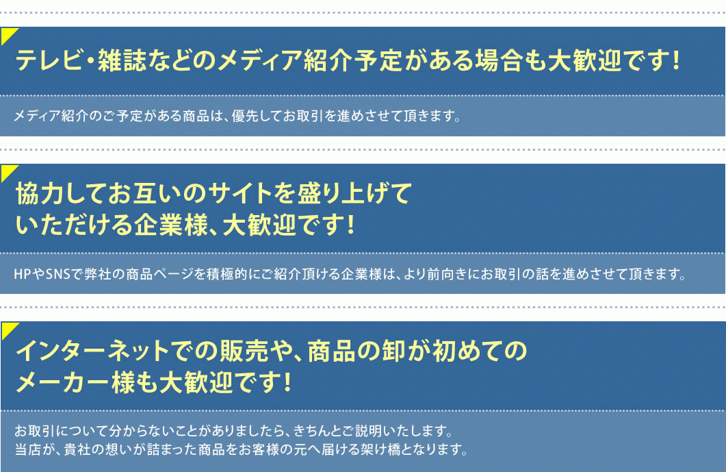 貴社から商品を仕入れる形で弊社が販売店になります。弊社へ卸販売をしていただくということになります。