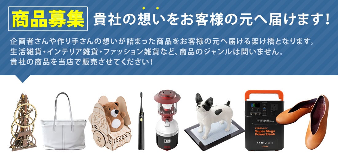 家具、生活雑貨、インテリア雑貨、ファッション雑貨、キャンプ、スポーツ、衛生用品、季節用品など、商品のジャンルは問いません。