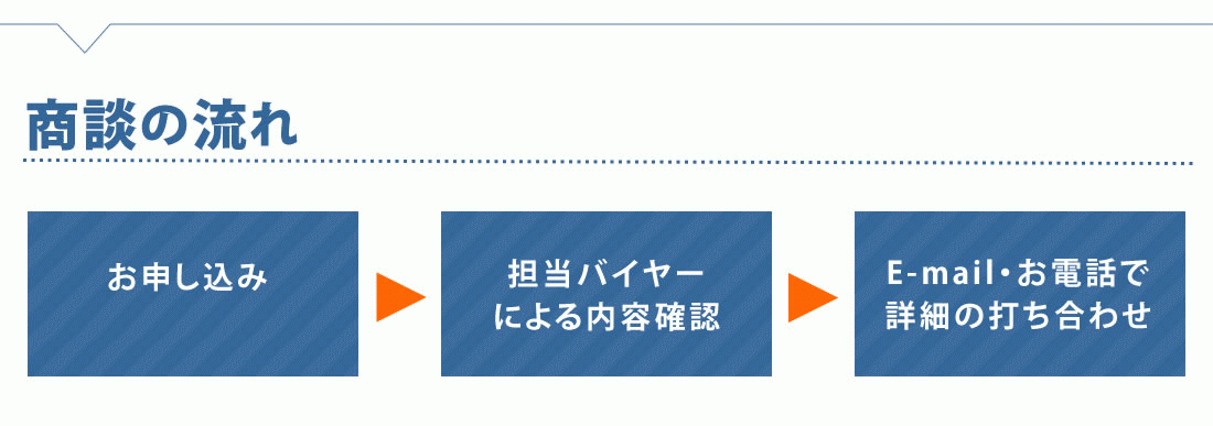 商材エントリー(メール)→弊社担当バイヤーチェック→内容を精査した上で、メール、またはお電話やZoomで詳細のご連絡・打ち合わせを行います。