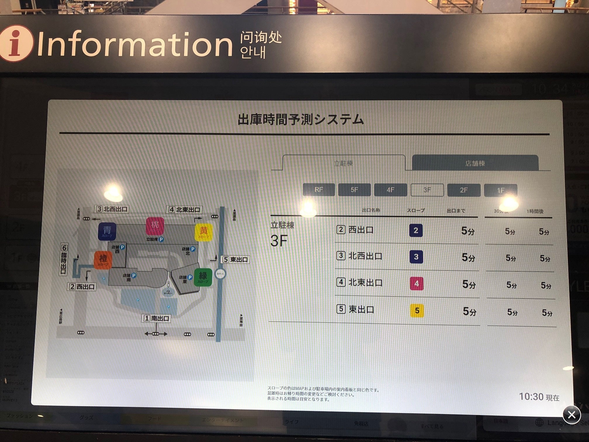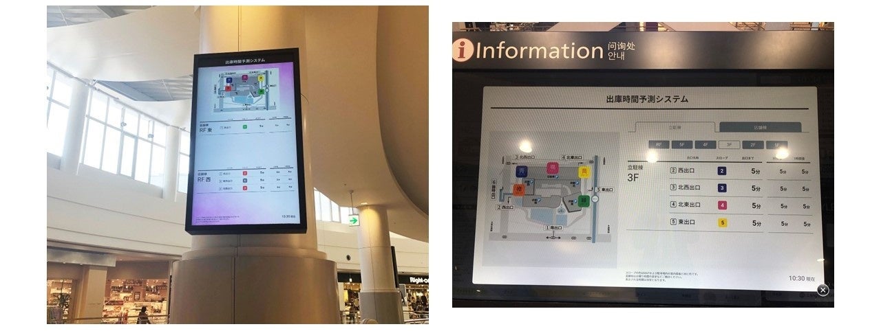 「イオンモール広島府中」においては、立体駐車場各フロアから各出口までの49ルートすべての出庫所要時間(表示時点の見込み値及び30分後・1時間後の予測統計値)を、施設内サイネージ、公式ウェブサイト・アプリに表示します。さらに今回は、立体駐車場5棟の一部に連絡通路があることに加え、混雑時は臨時出口も設けられる同施設の特性も考慮し、出口のスロープごとに塗られた色に合わせてサイネージ等媒体も配色。視認性を上げ、確認及びドライブ時の利便性を向上させました。施設側においてはカメラ画像とあわせて、混雑状況が一覧で確認できる他、臨時出口の表示有無も管理できるようになっています。