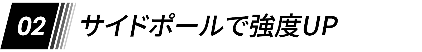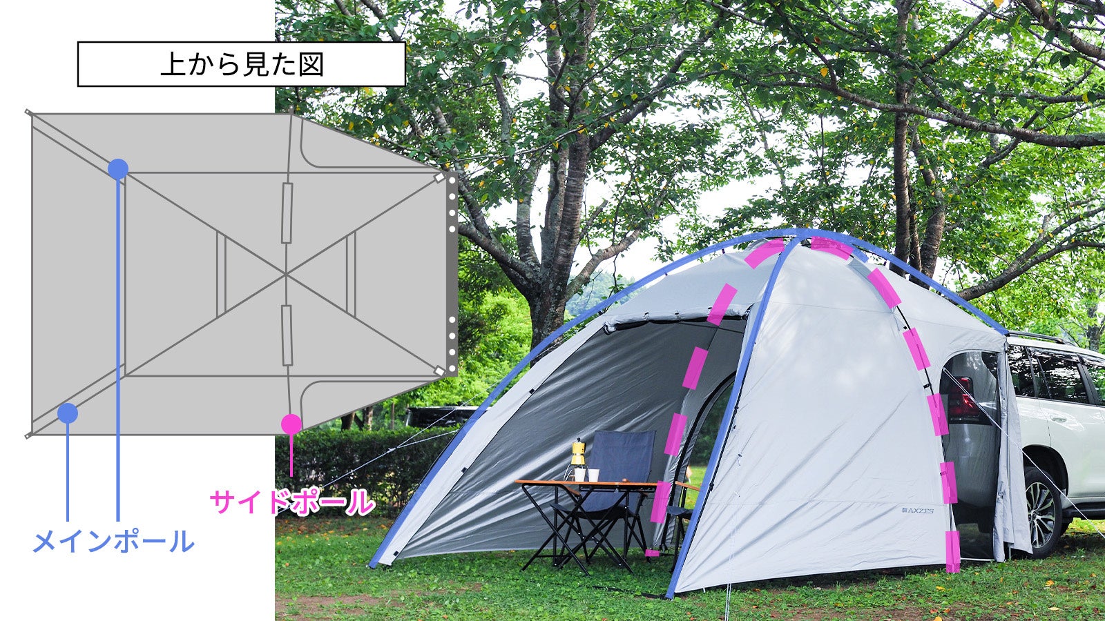 サイドポールがしっかりと接地して立ち、天井のアーチをキープすることで、ぐらつきに強い構造と高い天井を実現しました。