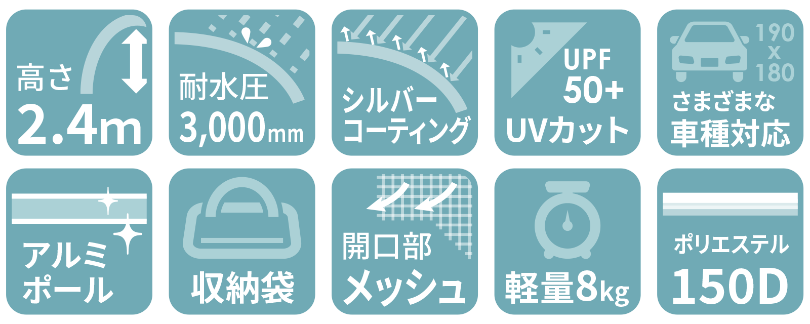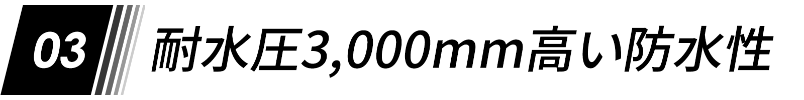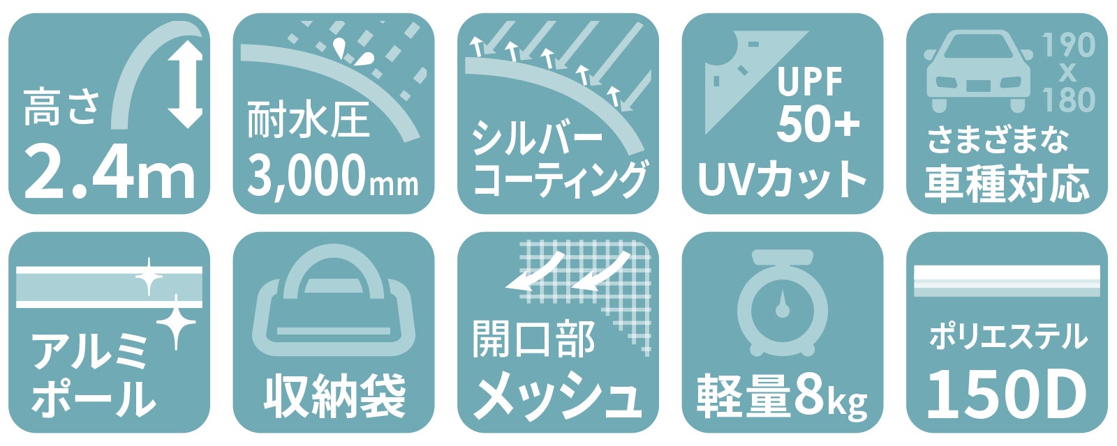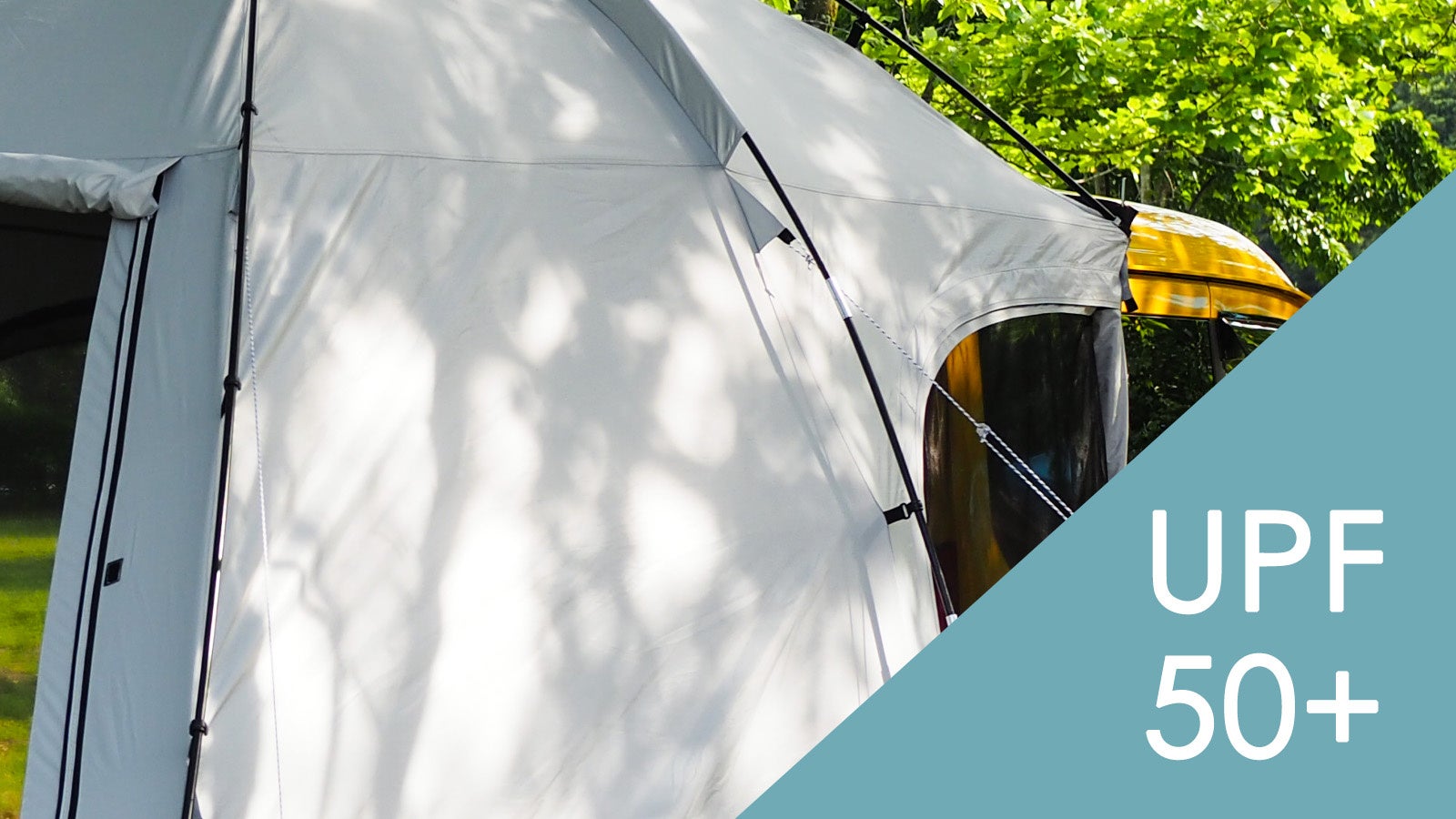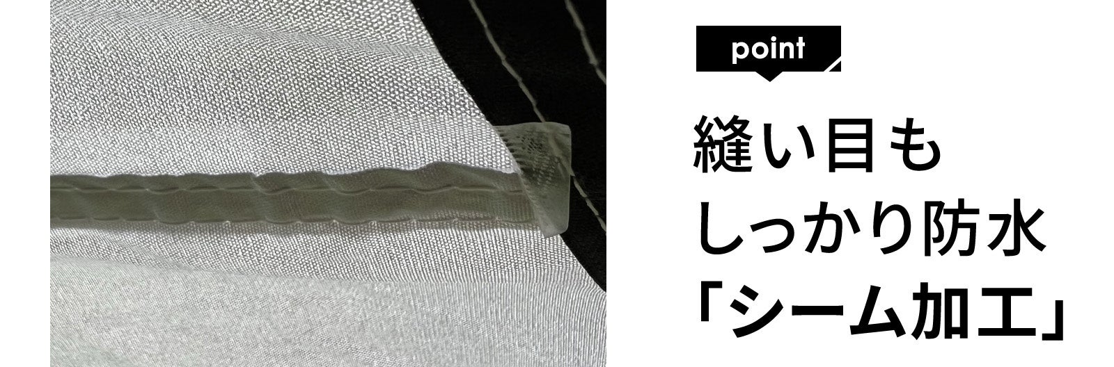 一般的なテントやタープで使われる生地の耐水圧は1,500mm前後が多いところ、本商品の耐水圧は3,000mm。急な雨からもしっかりガードします。