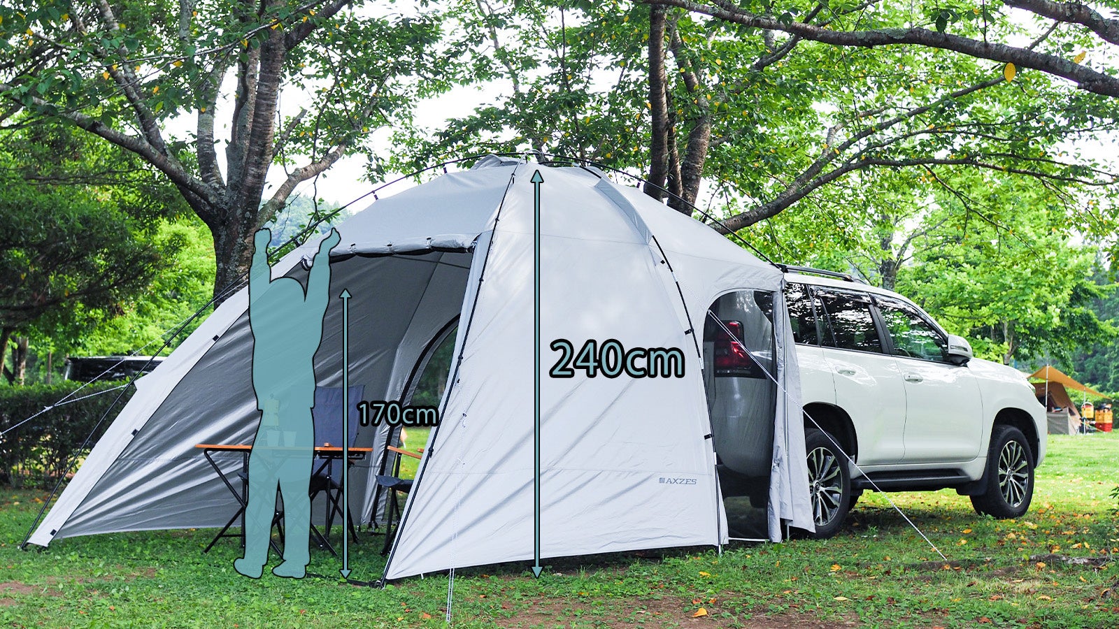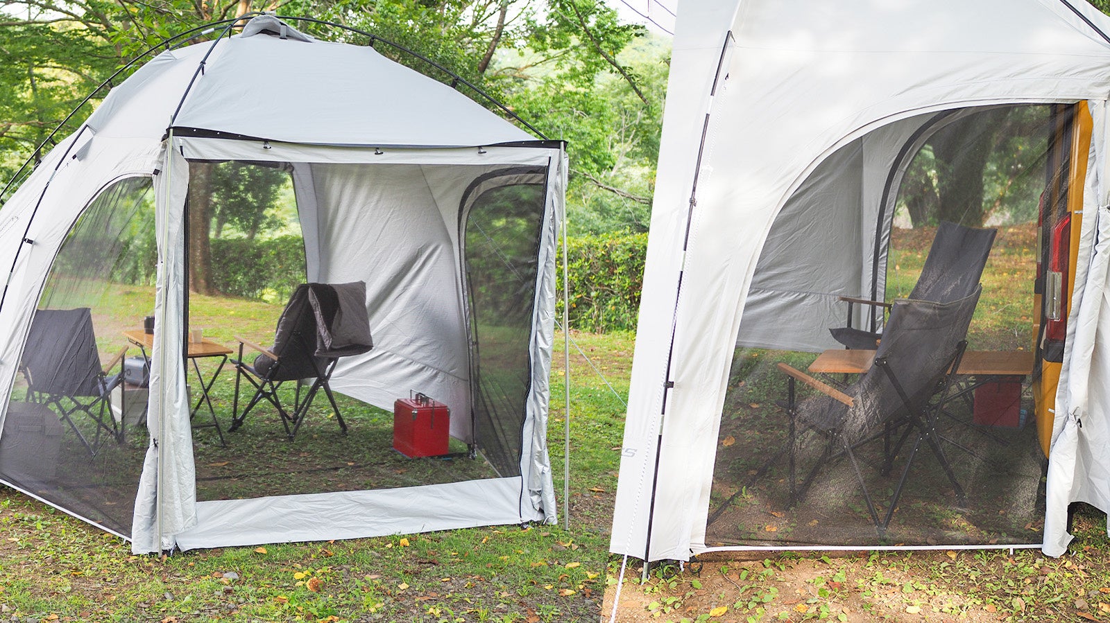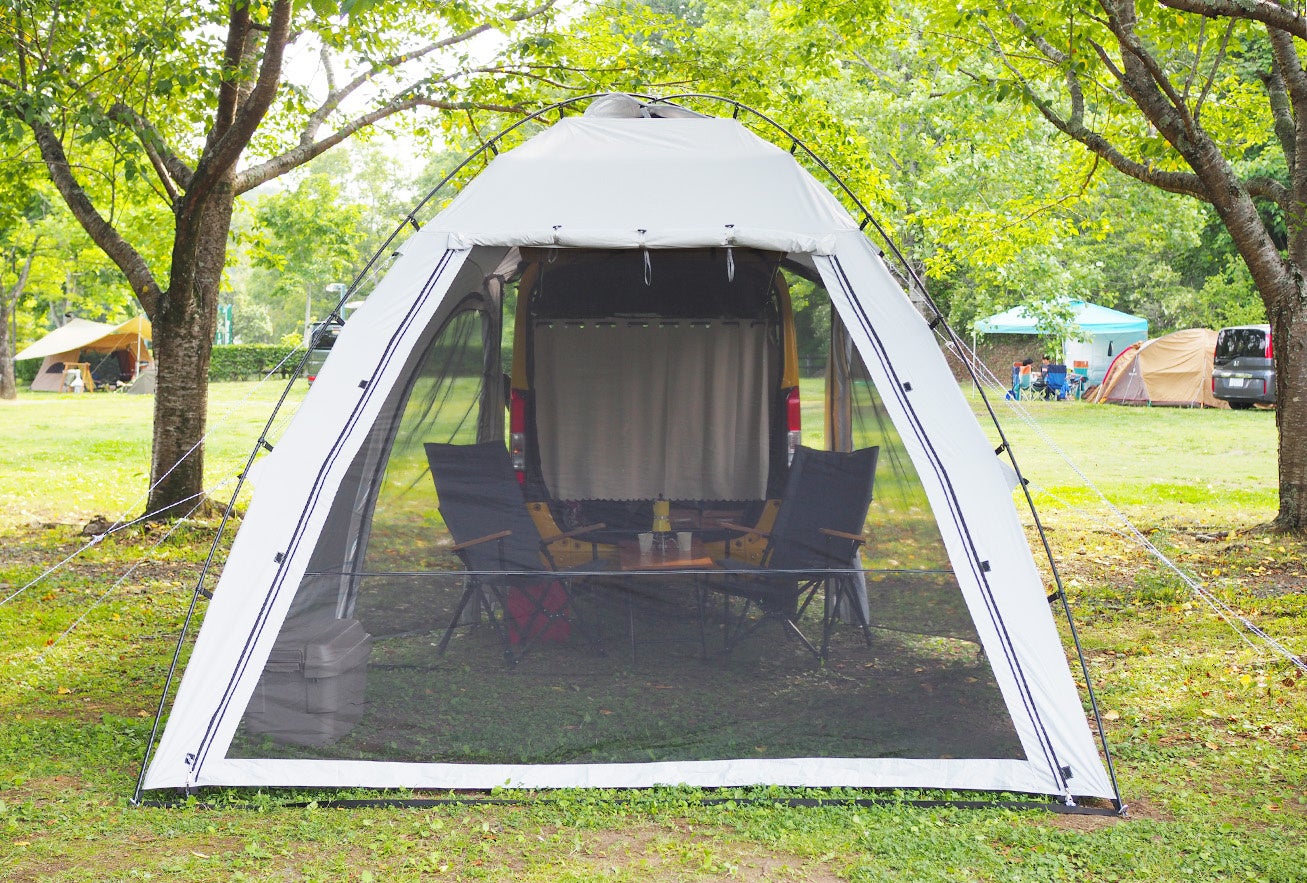 窮屈な車中泊はもう終わり!車(寝室)にリビングを追加するという発想のカーサイドシェルター誕生!