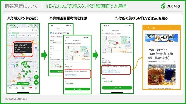 この度、多くのEVユーザーが利用するスマートフォン・アプリ『VEEMO(ビーモ)』のEVユーザー向けポイントサービス」に、当【EVごはん】のコンテンツを提供することにより、一人でも多くのEVドライバーが楽しく美味しいEVライフを体験できるようになることを願っております。