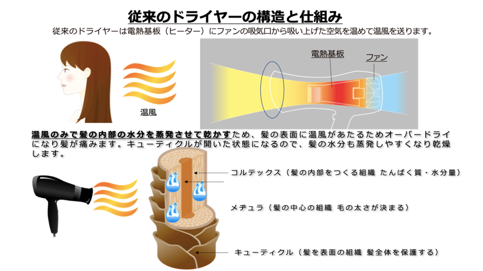 一般的なドライヤーは温風で乾かすものが主流のため、髪表面に風が当たり、キューティクルも開いた状態となるため、髪自体の水分が蒸発しやすく乾燥しやすくなることで髪のダメージ原因となります。
