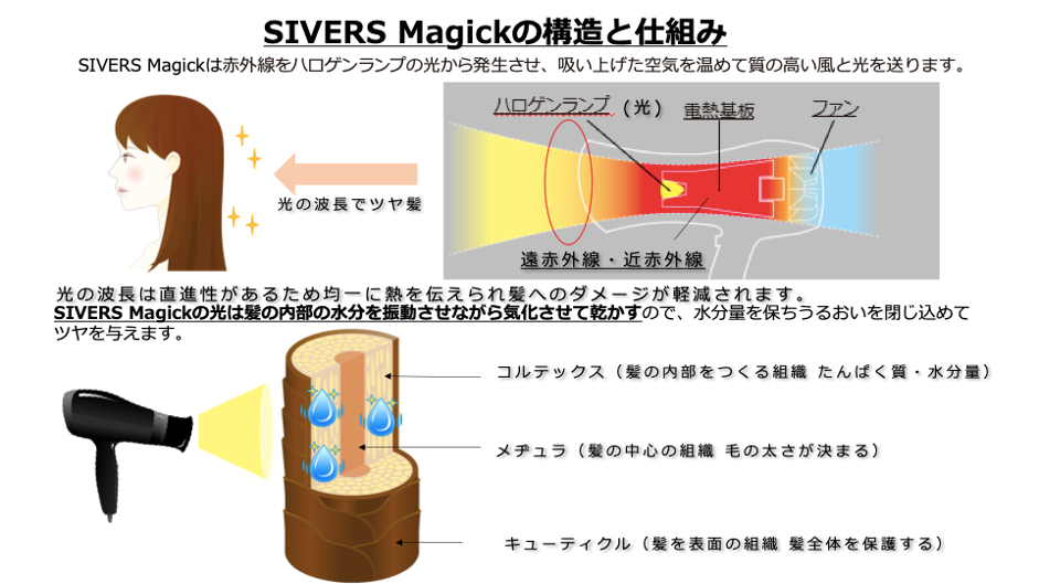 SIVERS MAJICKの光は髪の内部の水分を振動させながら気化させて乾かすので、水分量を保ちうるおいを閉じ込めてツヤを与えます。
