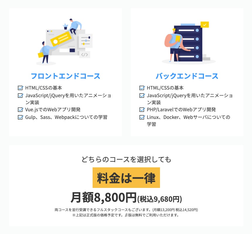 また、両コースを選択するフルスタックコースでは、単体よりもお得にシステム開発における全ての工程を網羅的に学習できます。