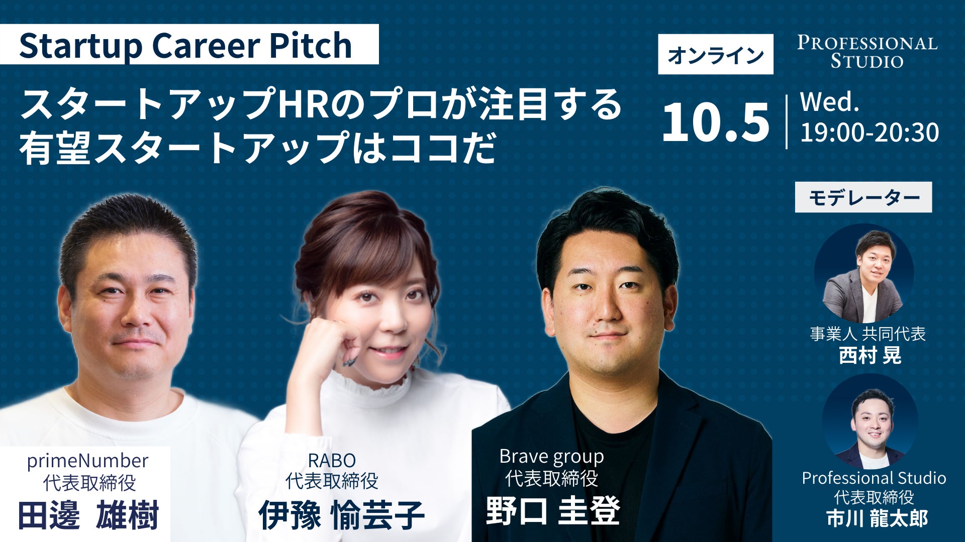 スタートアップ企業向けの採用/組織コンサルティング等を展開する合同会社事業人(本社:東京都渋谷区 共同代表:西村 晃 以下「事業人」)と、XTechグループでスタートアップ幹部人材向けキャリア支援を行うProfessional Studio株式会社(本社:東京都港区 代表取締役:市川 龍太郎 以下「Professional Studio」)は、スタートアップ業界でのキャリアを検討する人材向けのキャリアイベント「Startup Career Pitch」を2022年10月5日(水)にオンラインで開催いたします。