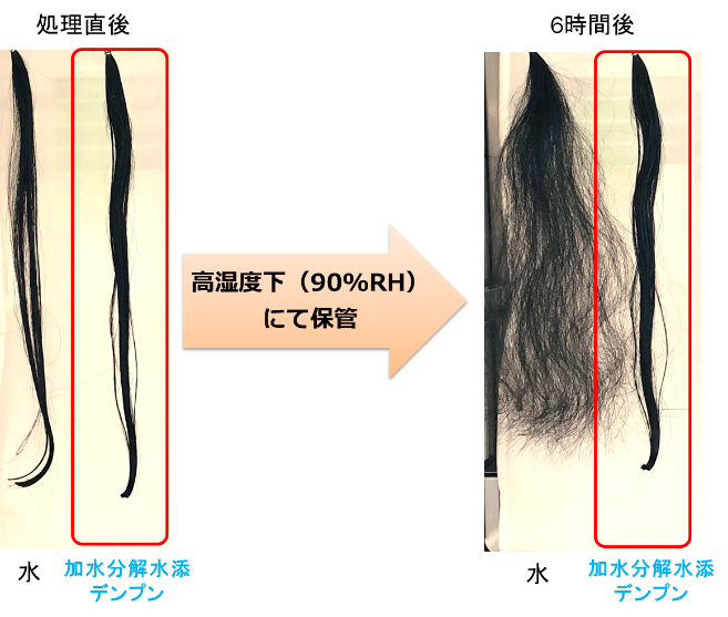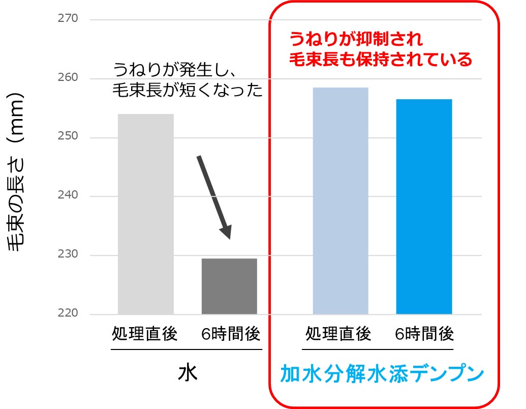 水で処理した毛束は処理直後に比べ、保管6時間後の毛束はうねり、毛束長が短くなっているのに対して、加水分解水添デンプンで処理した毛束は保管6時間後でも毛束の長さが保持されており、高湿度下でのうねり抑制効果を示しました。