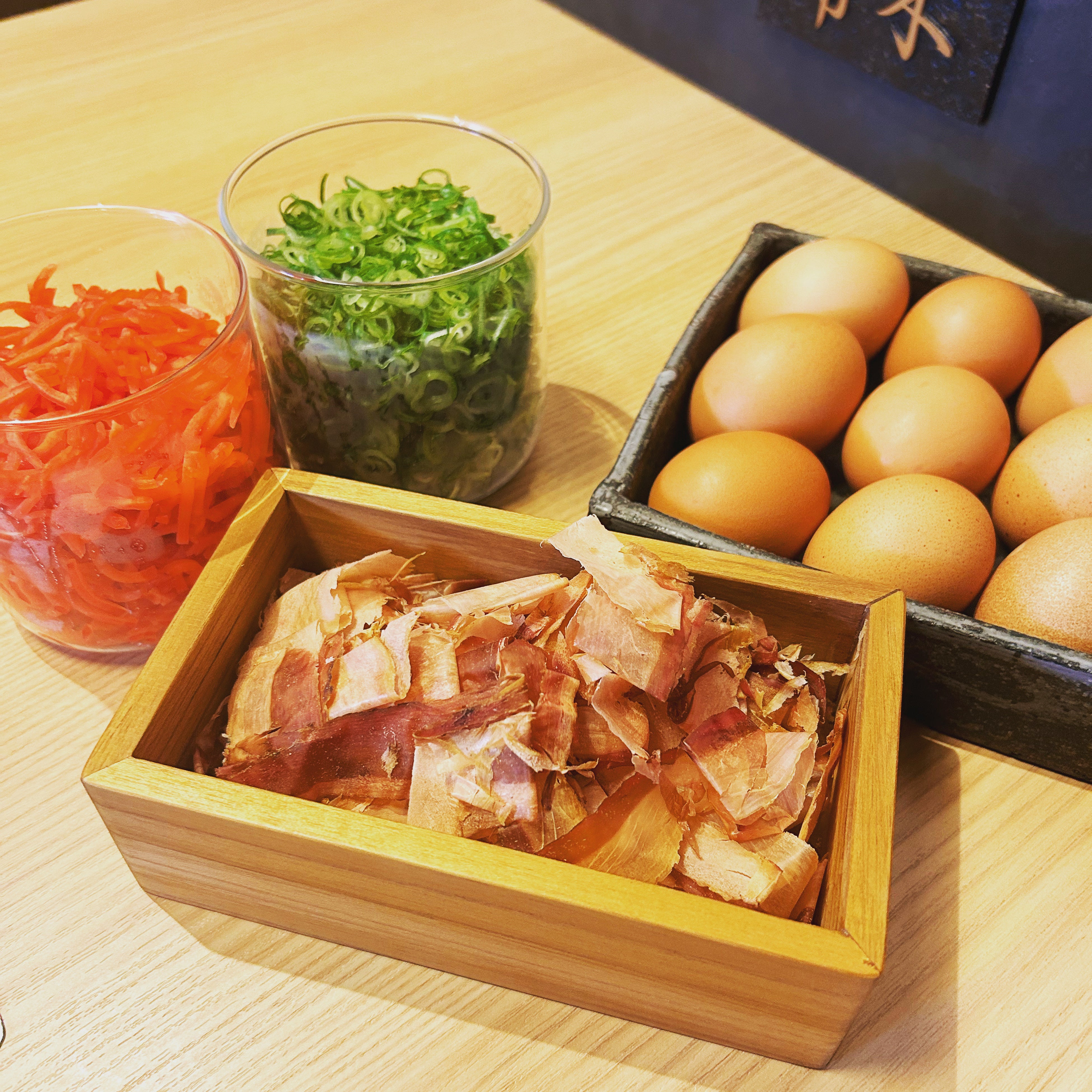こちらの黒毛和牛丼と合わせてお楽しみいただきたい薬味や調味料を卓上にご用意。