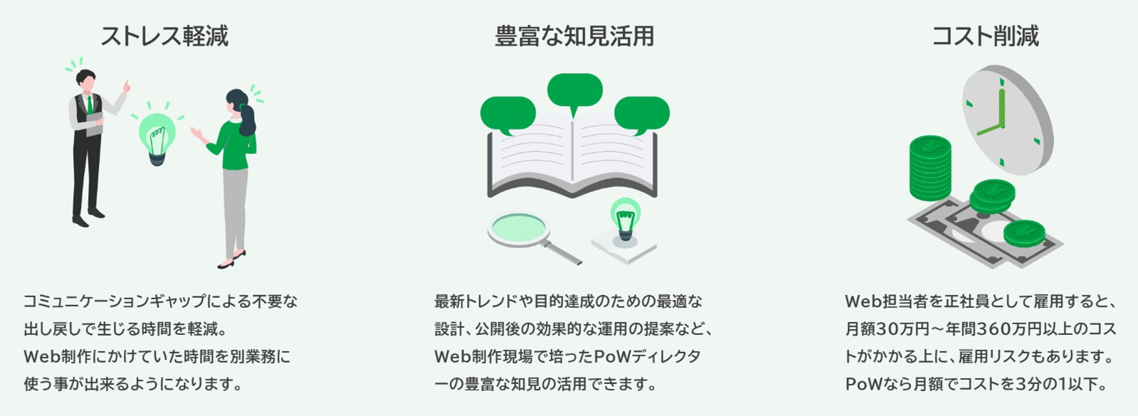 ①ストレス軽減、②豊富な知見の活用、③コスト削減