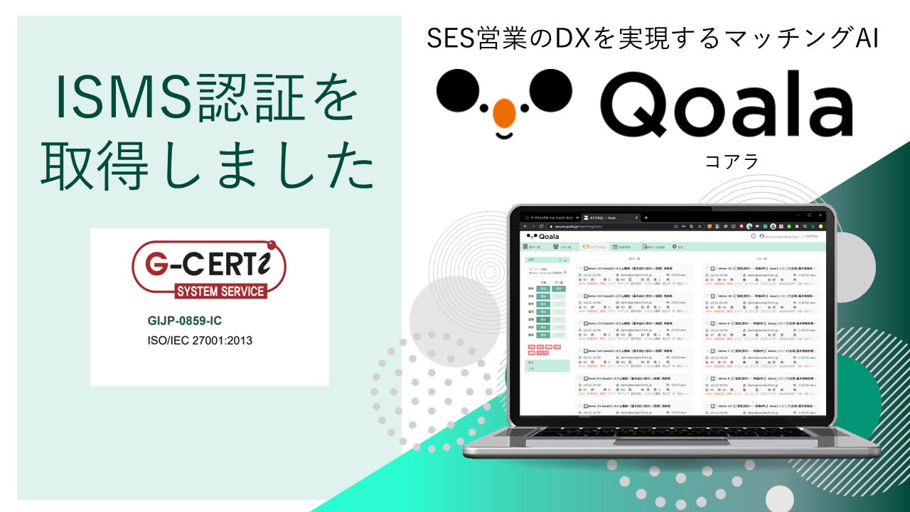 当社は、日本のIT産業の人材流動性に不可欠なSES業界をAIによってDX(デジタルトランスフォーメーション)するためのクラウドツール/SaaS「Qoala(コアラ)」を開発・提供しており、直近の利用者の増加に伴いお預かりする情報が大幅に増加しております。このような状況を踏まえ、当社としてはお客様の情報を安全に取り扱うことは事業活動において必須のものと考えており、情報セキュリティの維持・向上のみならず、情報管理・運用体制を強化すべく、今回の認証取得に至りました。
