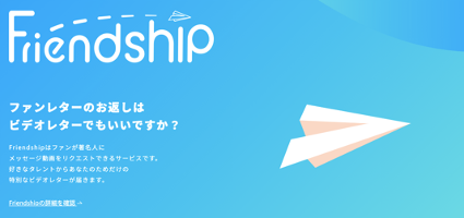 株式会社Friendship(所在地:東京都渋谷区、代表取締役CEO⻑濱宏季)は、この度、弊社の運営するFriendshipを活用したチャリティー企画を実施することをお知らせ致します。 Freindshipはファンが有名人にビデオレターのリクエストができるサービスです。 コロナ時代にファンとタレントが直接交流できる機会が減る中、タレントがあなたのためだけに撮影したビデオレターを届けます。