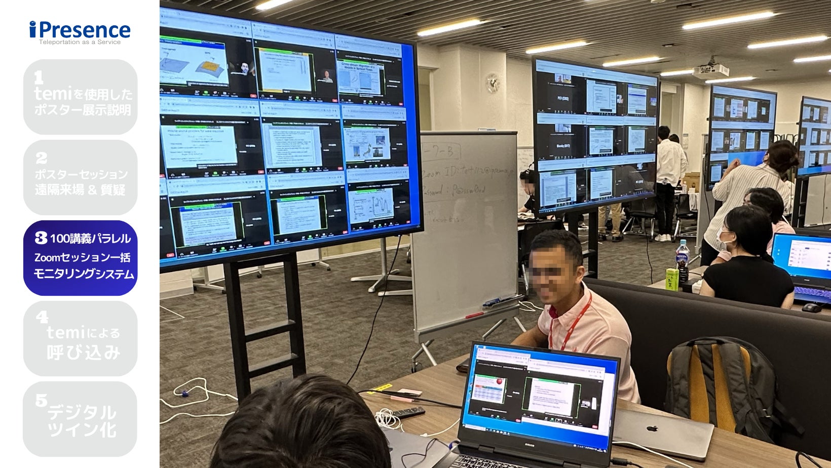 100以上のZoom配信の講義が実施期間5日間を通してパラレル同時開催となり、iPresenceが提案した独自のモニタリングシステムが活用されました。4K画質の65インチモニター8台と高スペックゲーミングパソコン8台を利用してZoom配信12〜13セッション(計100セッション)に同時アクセス、専用インターネット回線を準備し、通常であれば100台のパソコンと100人の人員でモニタリングが必要な規模のイベント支援を大幅に効率化させることに成功しました。
