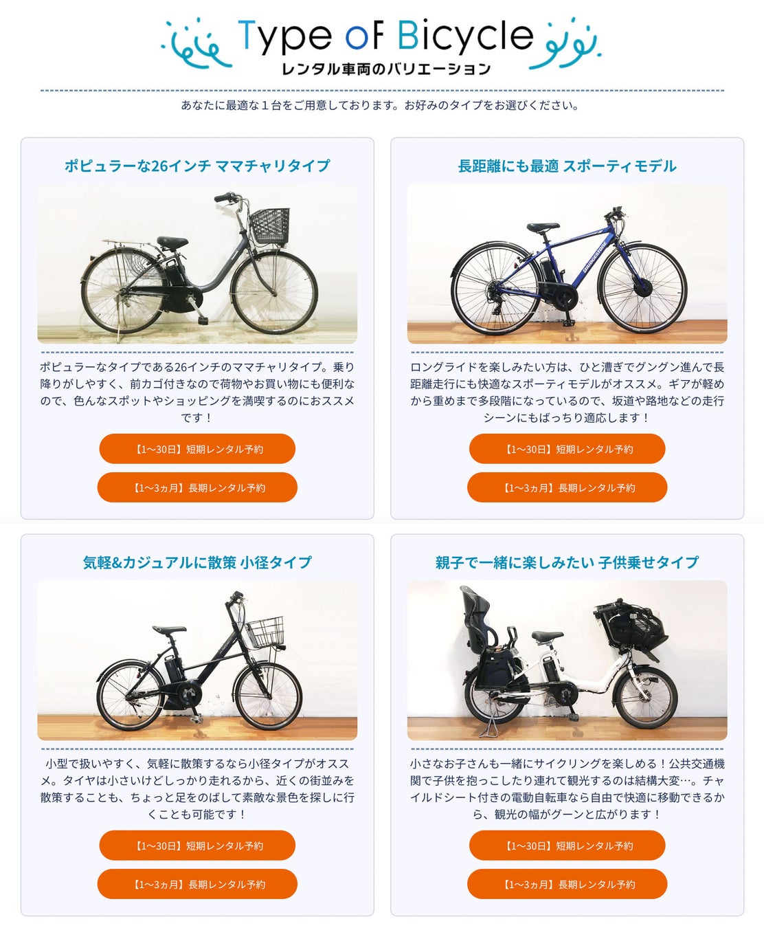 さらに、4月より努力義務化となったヘルメットを無料レンタルし、安全な自転車旅を提供します。チャイルドシートや子供用ヘルメットも無料レンタルで、ご家族でのお出かけもしっかりサポート!