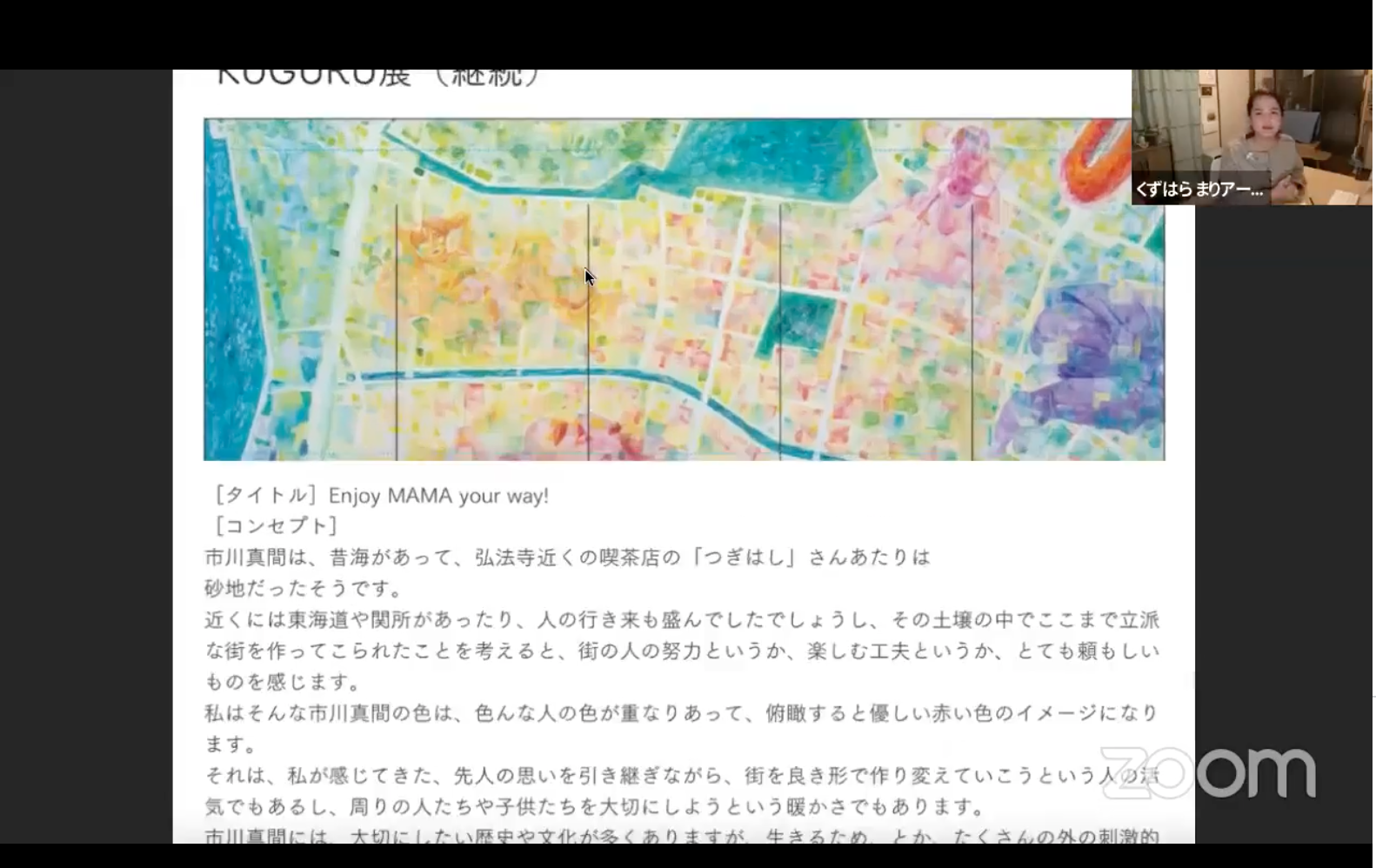 ファシリテーターの進行のもと、真間とその作品との繋がり、視聴者が聴きたいことなどをアーティストから引き出しました。フェイスブックライブ中にトークの感想などを積極的にコメントされる方もいらっしゃいました。