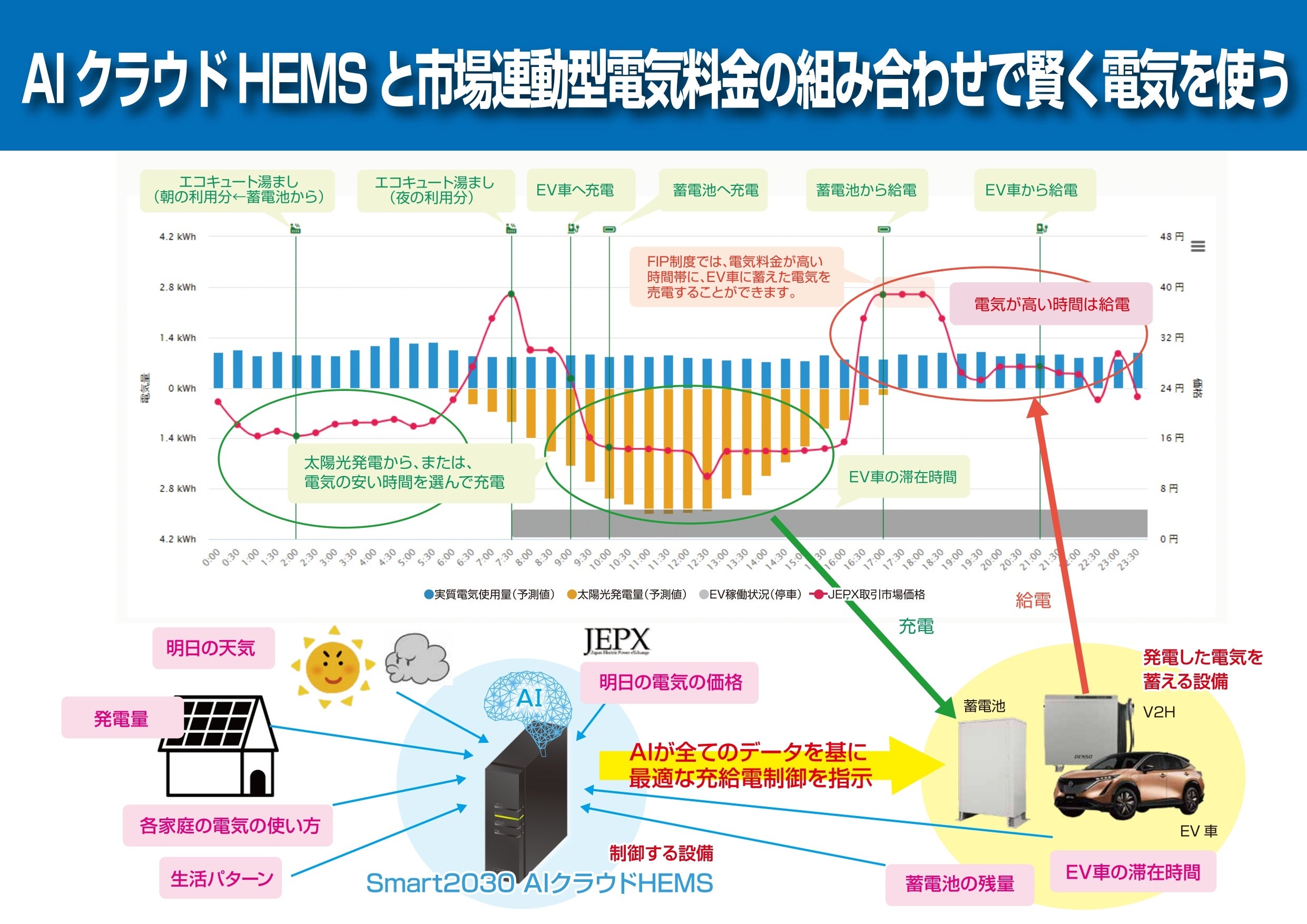 AIクラウドHEMS「省エネの達人®」は、電力会社からの要請に応じて蓄電池やV2Hからの充放電のコントロールに協力し、電力系統の安定化と再生可能エネルギー有効活用にも寄与する予定です。