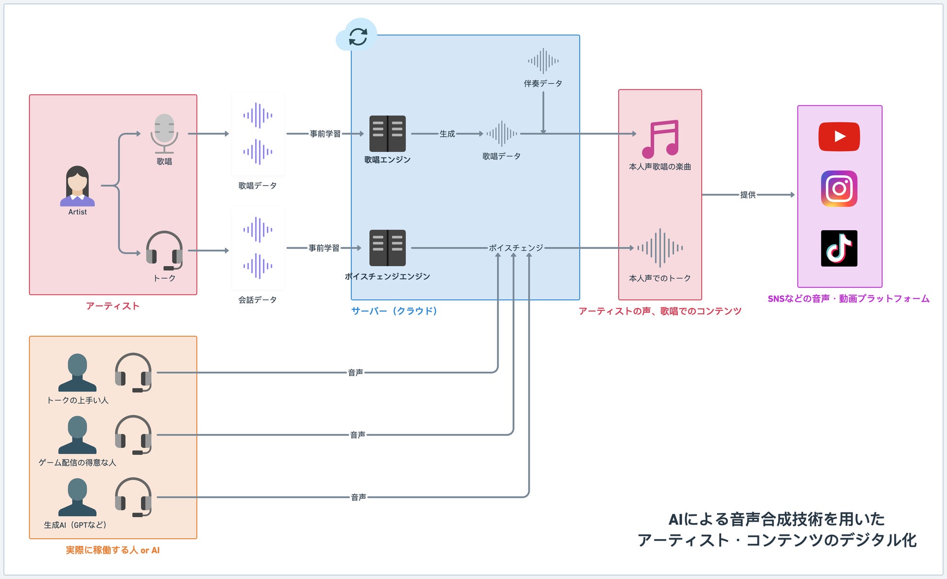 歌声や会話の音声を学習、忠実に再現するAIを用いた音声合成技術や歌唱生成技術を用いることで、「中の人」が不在、もしくは入れ替わってもIPとしてのアイデンティティを保つ仕組みを構築