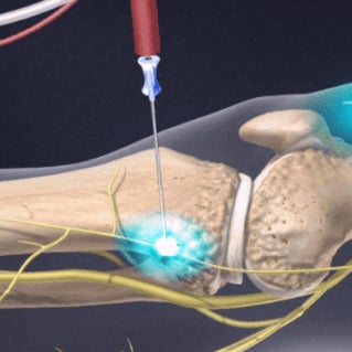 本治療は、整形外科的な外科的治療の対象とならない変形性関節症に伴う慢性疼痛を有する患者のうち、既存の保存療法で奏効しない患者に対して、末梢神経に高周波電流を供給し、神経を加温・凝固(焼灼)させることによって、疼痛治療を行います。