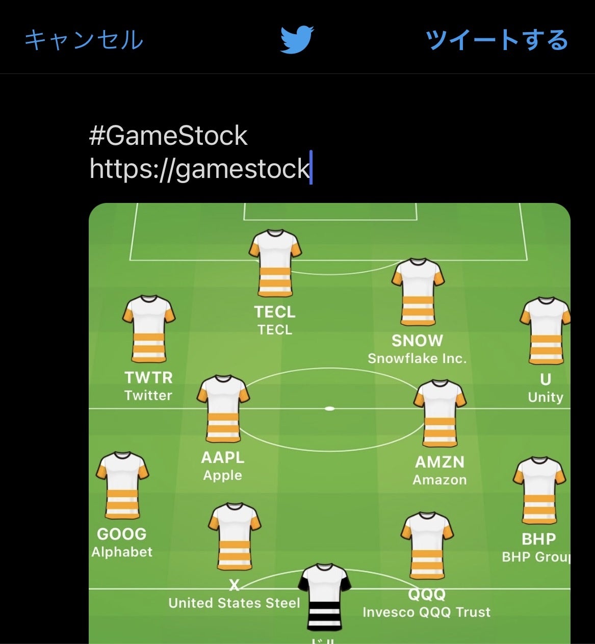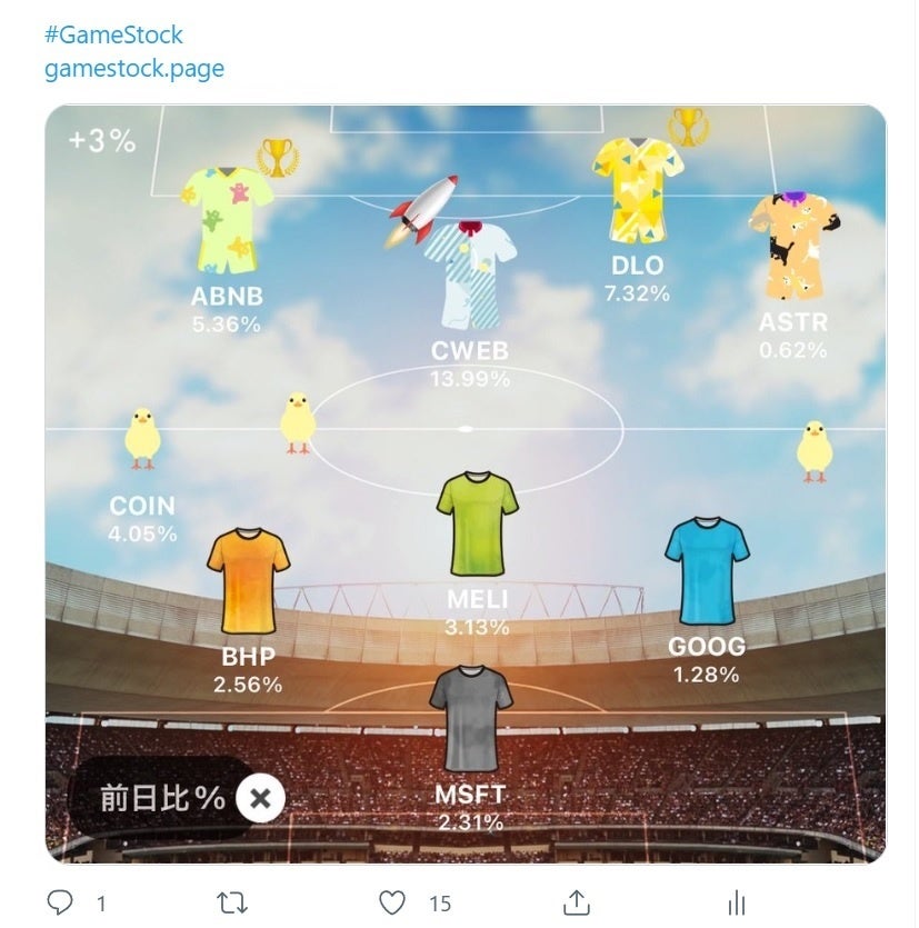 自分のチーム(ポートフォリオ)やその付帯情報含めてツイッターに投稿したり(#GameStockで検索)、前日比プラス・マイナスで銘柄やフィールドに様々なエフェクトが発現します。