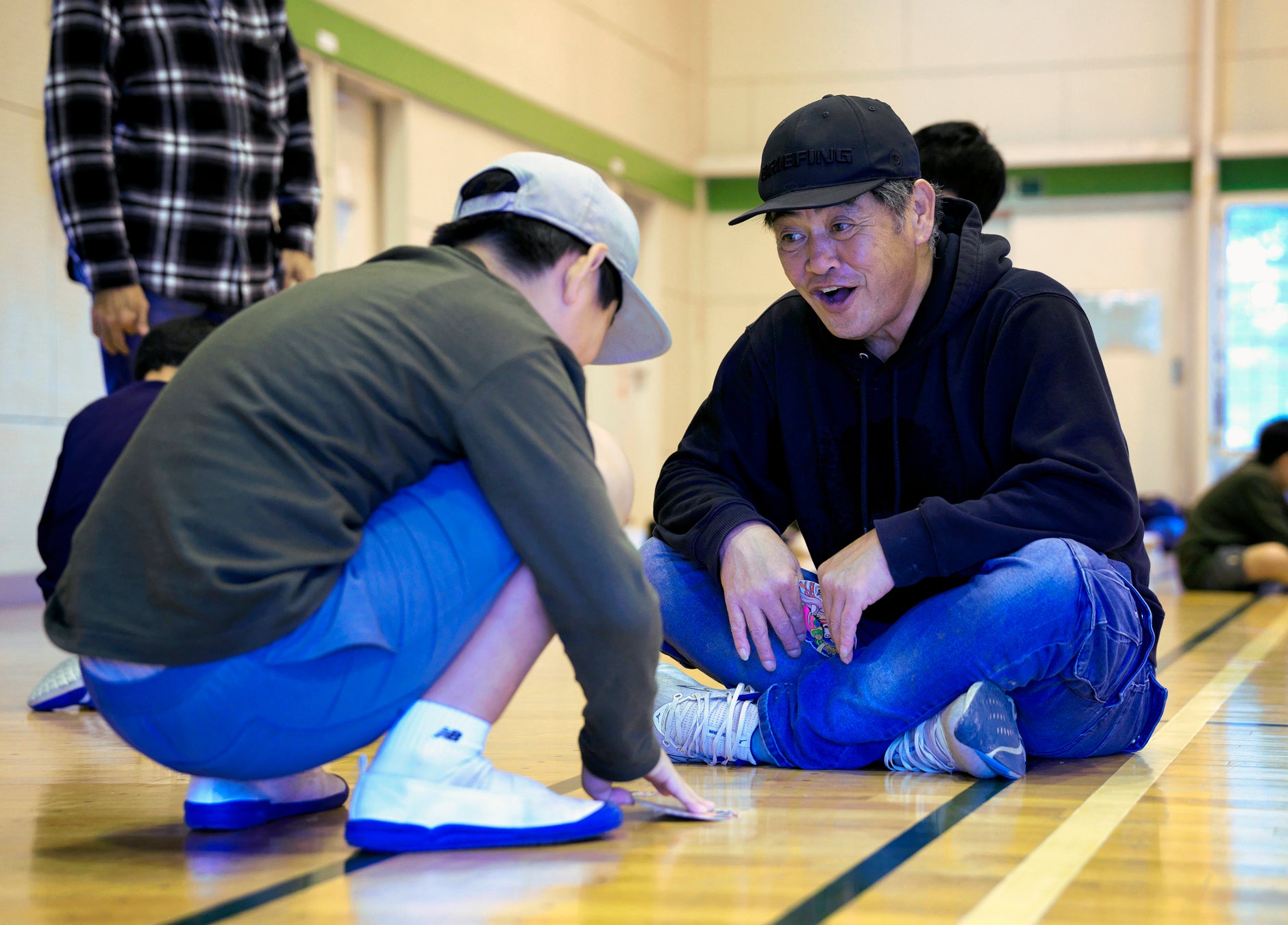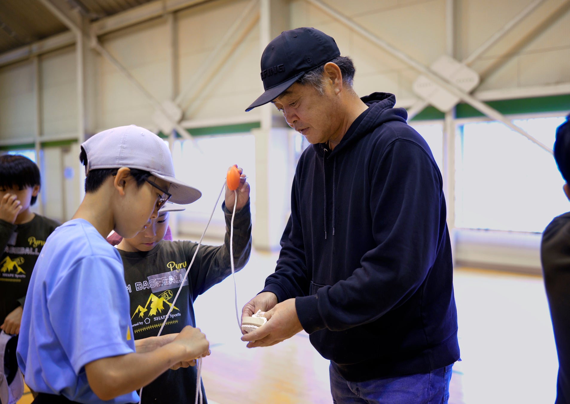 収穫後は体育館に移動し、野球教室を実施。「遊びの中にある野球が上手くなるヒント」をテーマに、ピンポン玉に数字を書いて動体視力を鍛えるウォーミングアップのほか、メンコ・駒遊び・ドッジボールなどの“遊び”を通じて、ボールを投げる・回転をかける・体を使う感覚を学びました。