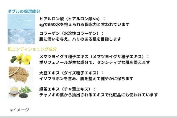 ヒアルロン酸、コラーゲン、大豆エキス、緑茶エキス、メマツヨイグサ種子エキスを贅沢に配合