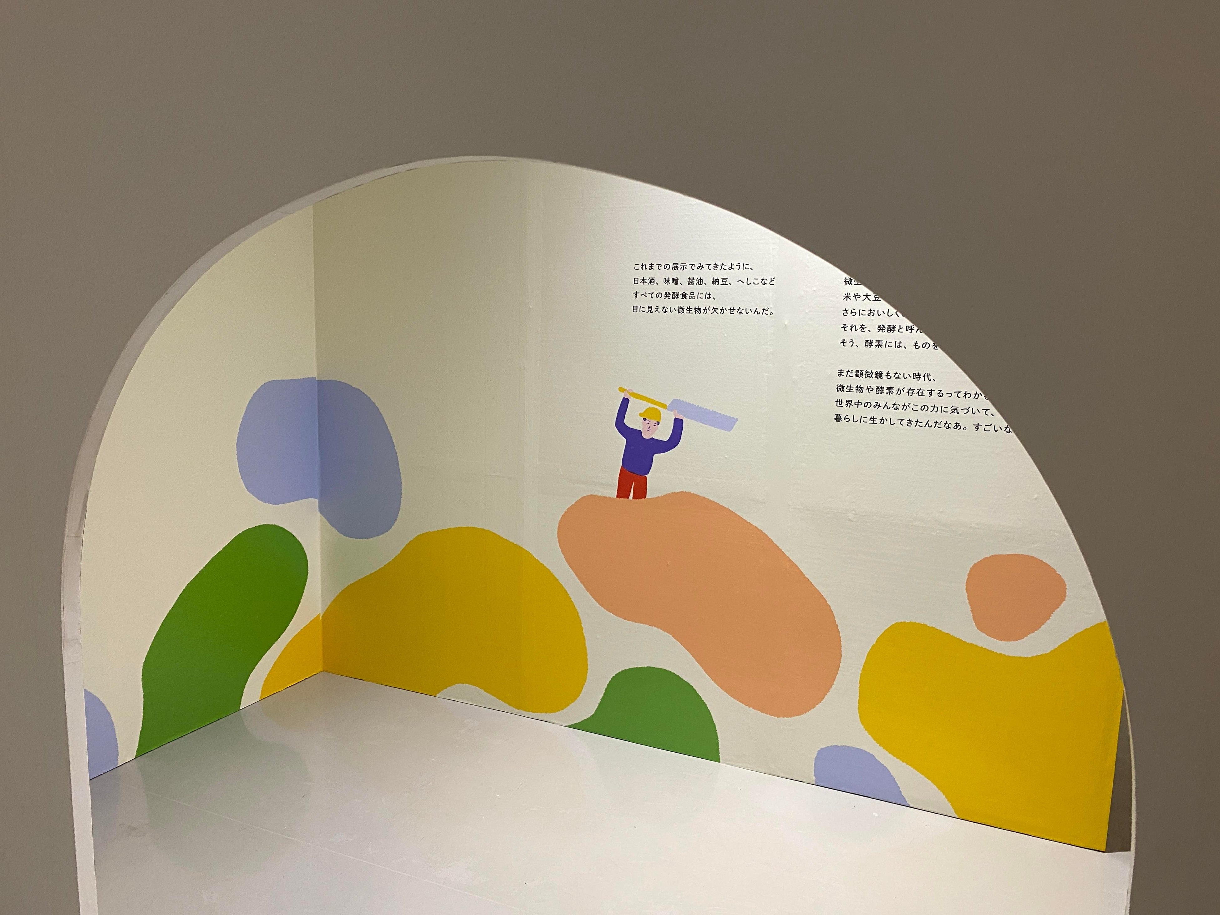 目に見えない酵素の世界を表現するために、本プロジェクトでは、イラストレーターとして世界的アーティストのポール・コックスさんにご参画いただきました。酵素の世界を色鮮やかなイラストで描いていただいております。WEBサイト立ち上げ時にから酵素の世界の案内役を務めるのは、オリジナルキャラクター「酵素くん」。 今回の展覧会でもこの「酵素くん」がリアルな案内役として、各展示のナビゲート役を務めており、「分解」や「合成」といった酵素の働きを、酵素くんの動きにあわせて楽しみながら学べる仕掛けとなっています。