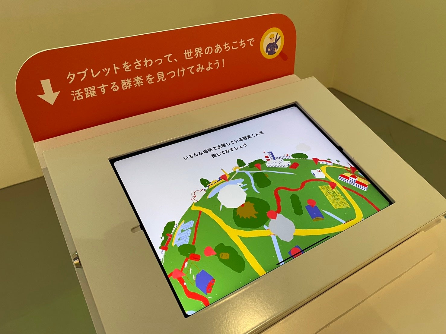 WEBサイトの人気コンテンツ「酵素の宇宙図」が展示会場に登場。来場者は手元のタブレットで操作しながら、宇宙図のさまざまなところに隠れた、酵素のはたらきを探して学ぶことができます。
