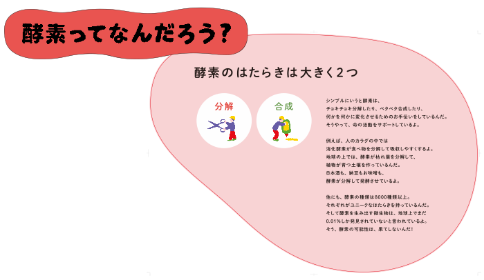 アニメーション動画や宇宙図で触れた酵素のはたらきを、分かりやすく解説。酵素についてより詳しく学ぶことができます。